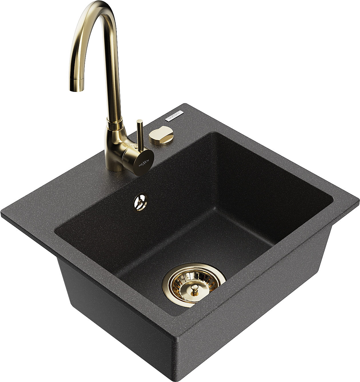 Mexen Milo granīta izlietne ar vienu nodalījumu un virtuves jaucējkrānu Telma, melns ar pleķiem - 6505-76-670200-50