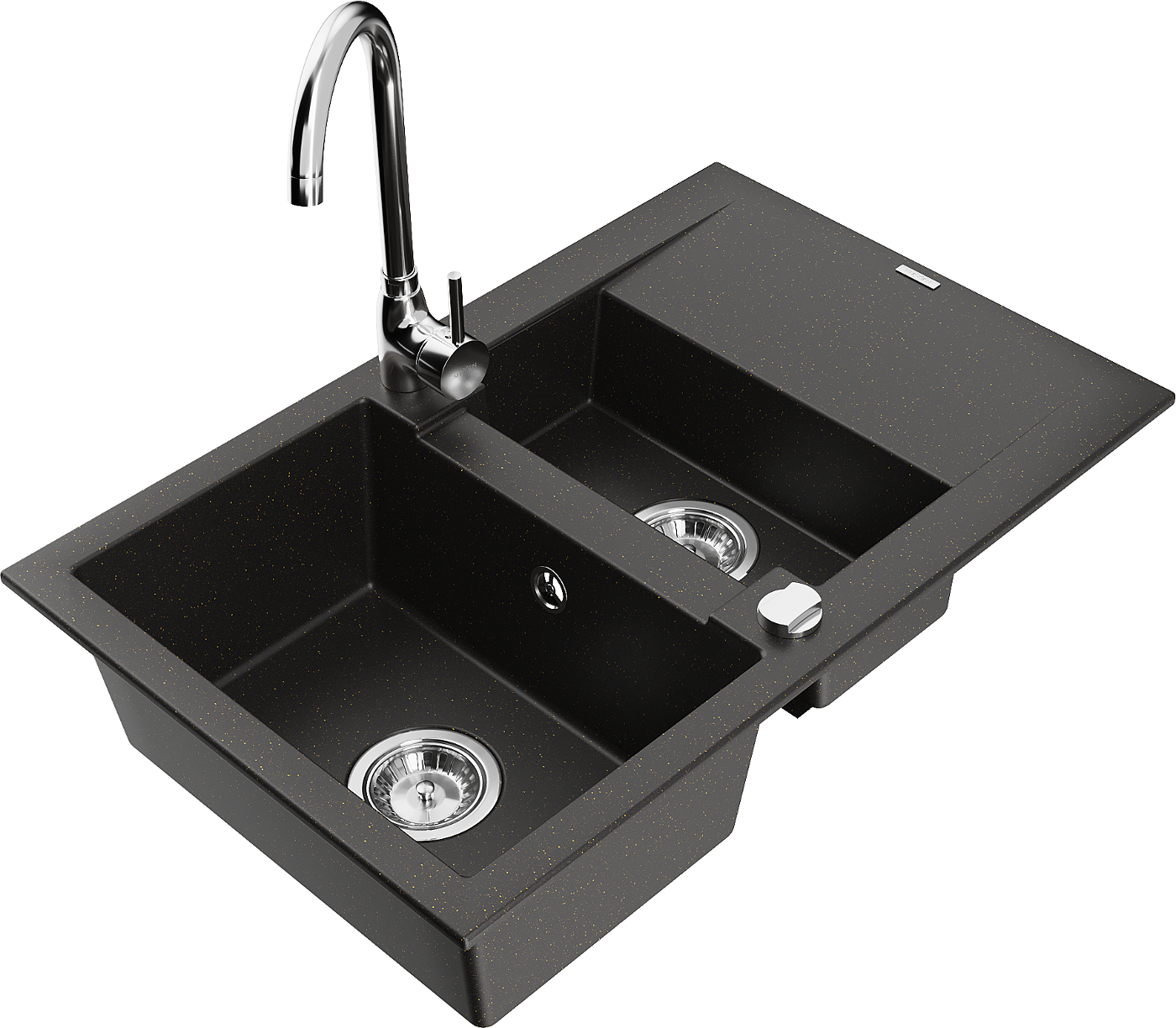 Mexen Gaspar granitã izlietne 1,5 nodalījumu ar noteces plāksni un virtuves jaucējkrānu Telma, melns/zeltīts - 6507-75-670200-00