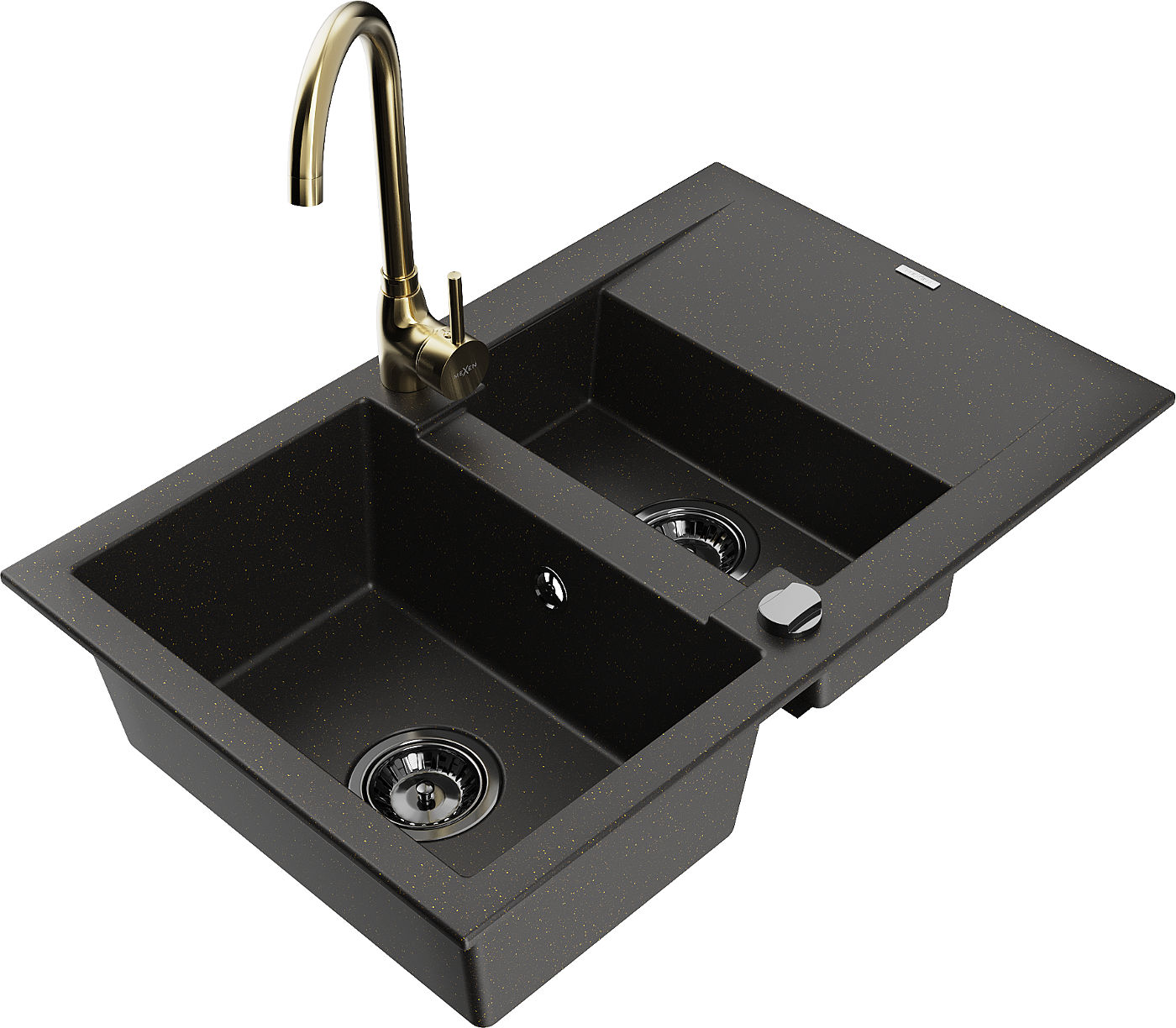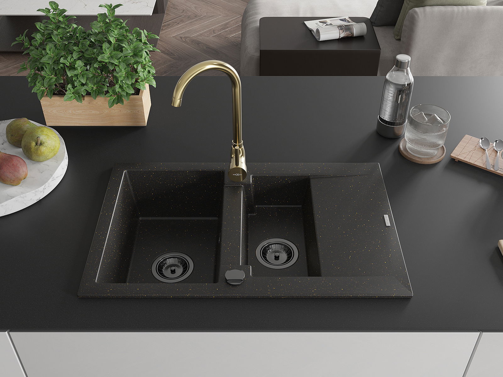 Mexen Gaspar granīta izlietne ar 1,5 nodalījumu, notecējumu un virtuves jaucējkrānu Telma, melns/zeltains - 6507-75-670200-50-B
