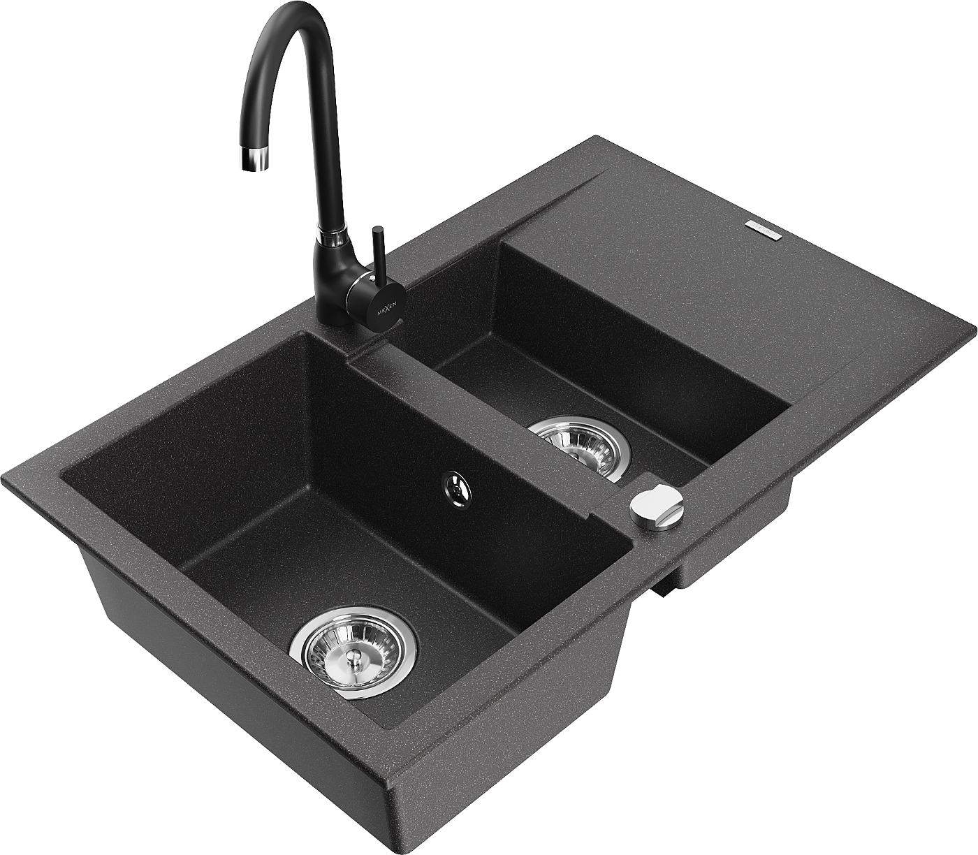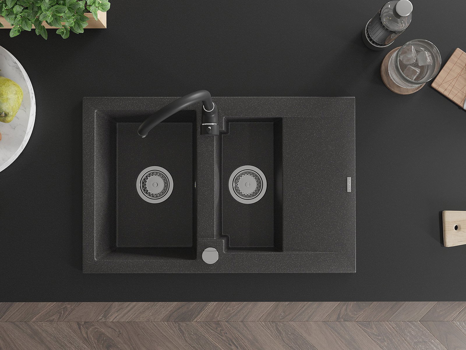 Mexen Gaspar 1,5 nodalījumu granīta izlietne ar noteku un virtuves jaucējkrānu Telma, melna ar punktiem - 6507-76-670200-70