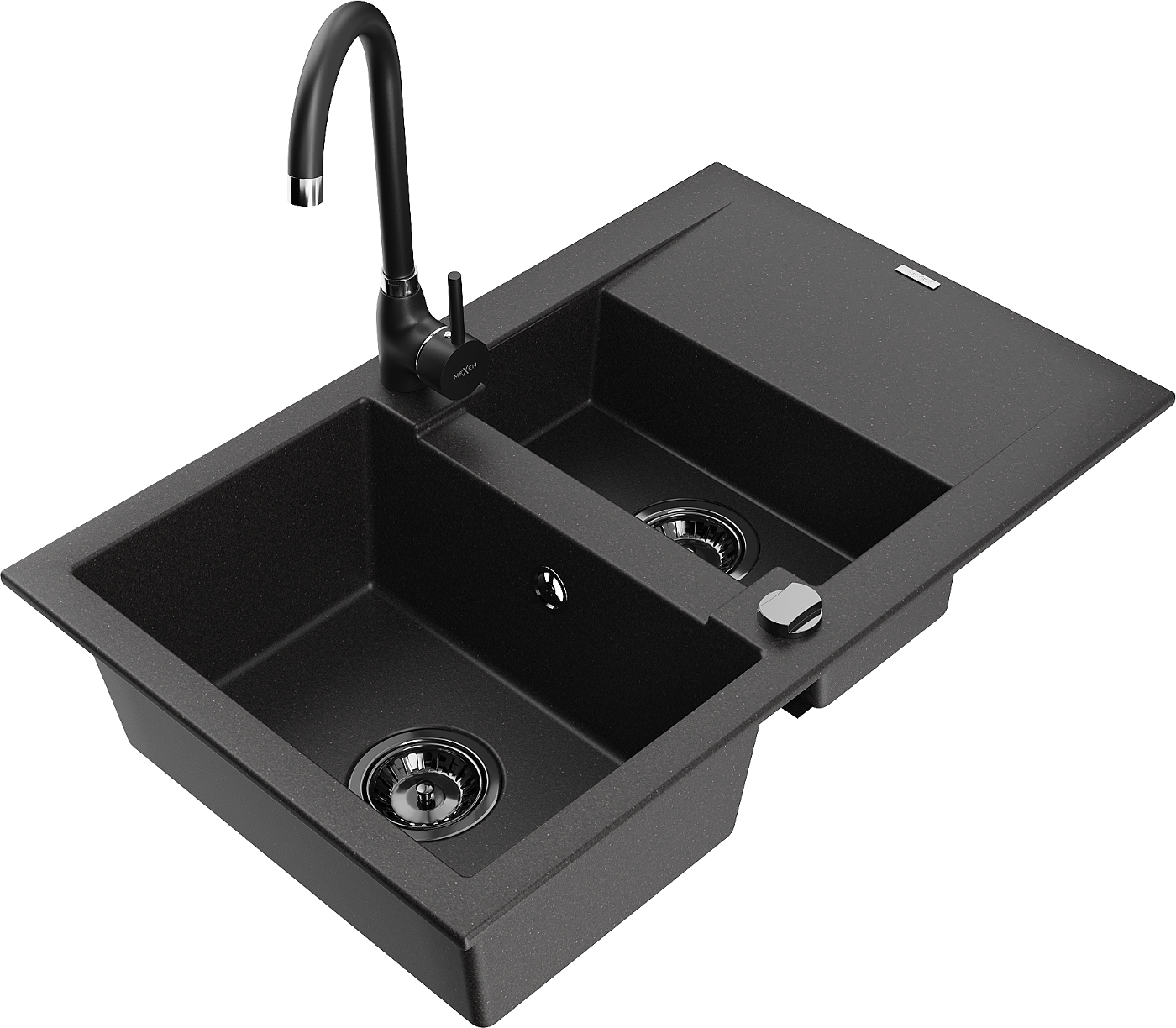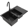 Mexen Gaspar granit izlietne ar 1,5 nodalījumu, ar nožāvēšanas plauktu un Telma virtuves krānu, melna - 6507-77-670200-70-B