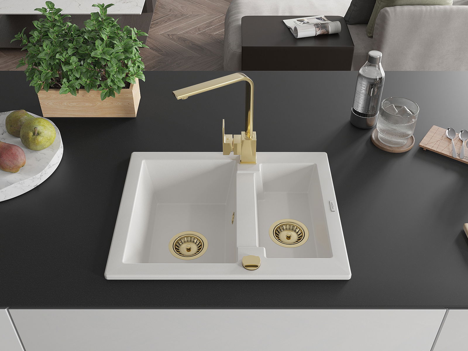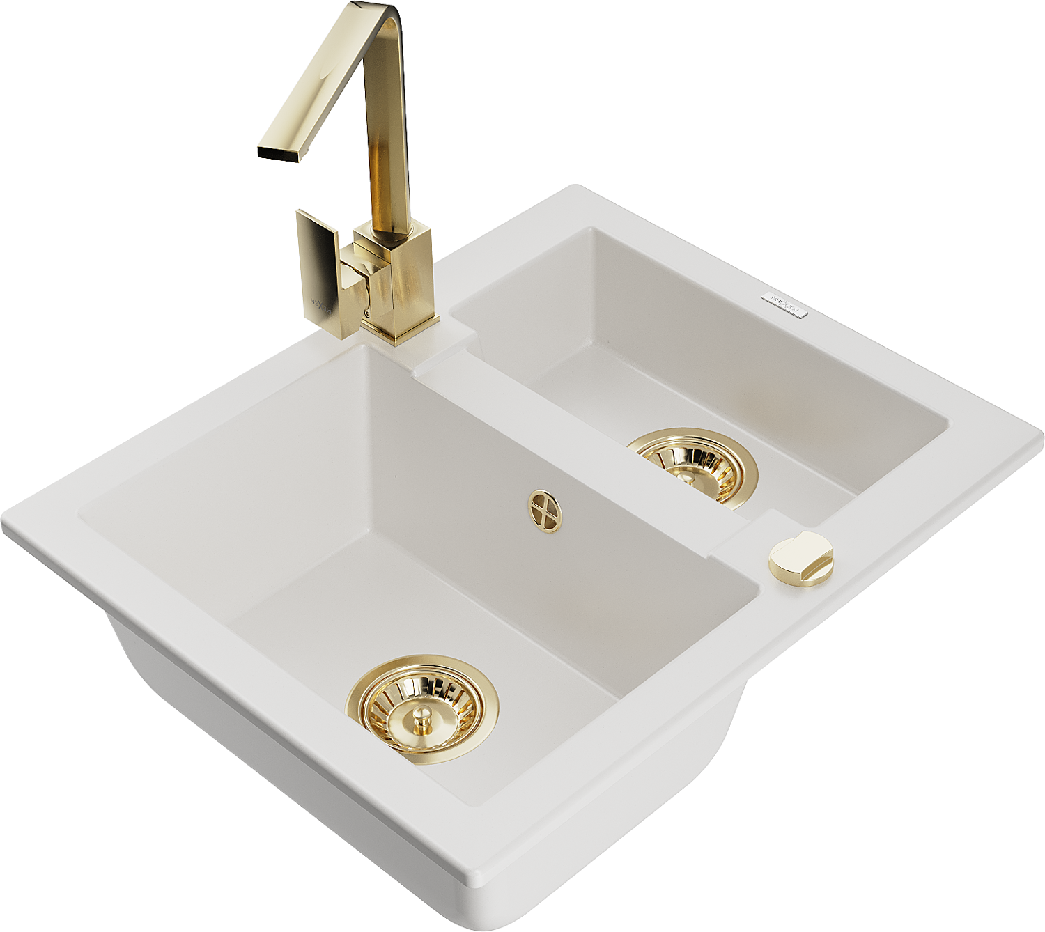Mexen Carlos granitizlietne izlietne ar 1,5 nodalījumu un virtuves jaucējkrānu Rita, balta - 6518-20-670300-50