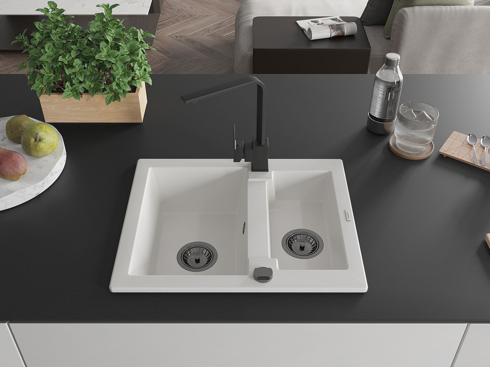 Mexen Carlos granitā izlietne ar 1,5 nodalījumiem un virtuves jaucējkrānu Rita, balta - 6518-20-670300-70