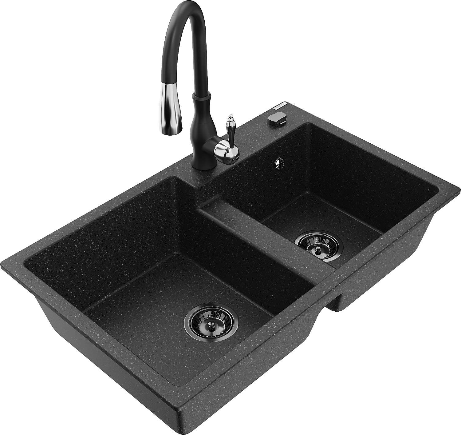 Mexen Tomas granit izlietne ar divām kamerām un virtuves jaucējkrānu Savita, melns/sudraba metālika - 6516-73-672601-70-B