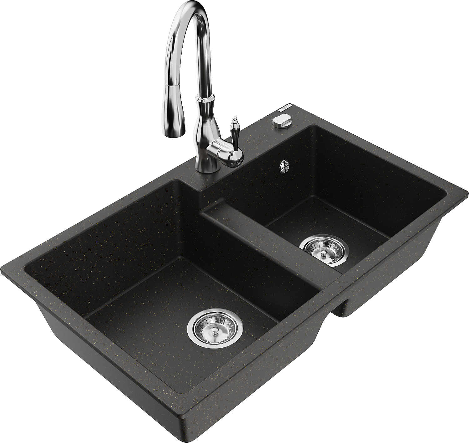 Mexen Tomas granit izlietne ar 2 nodalījumiem un virtuves jaucējkrānu Savita, melns/zeltains metāliks - 6516-75-672601-00