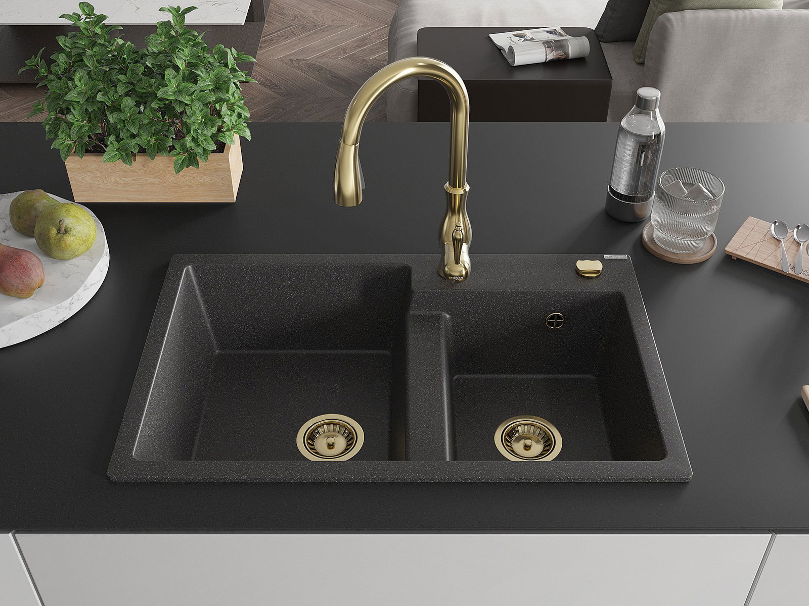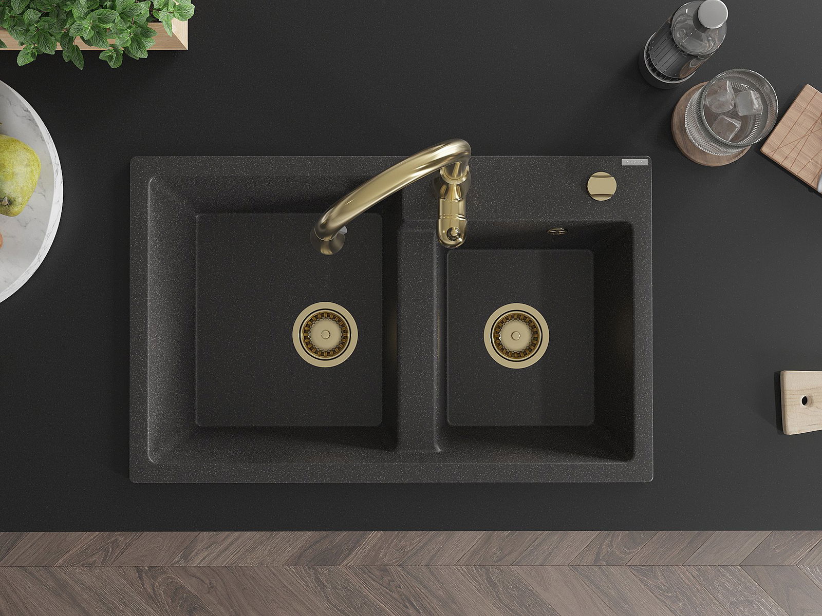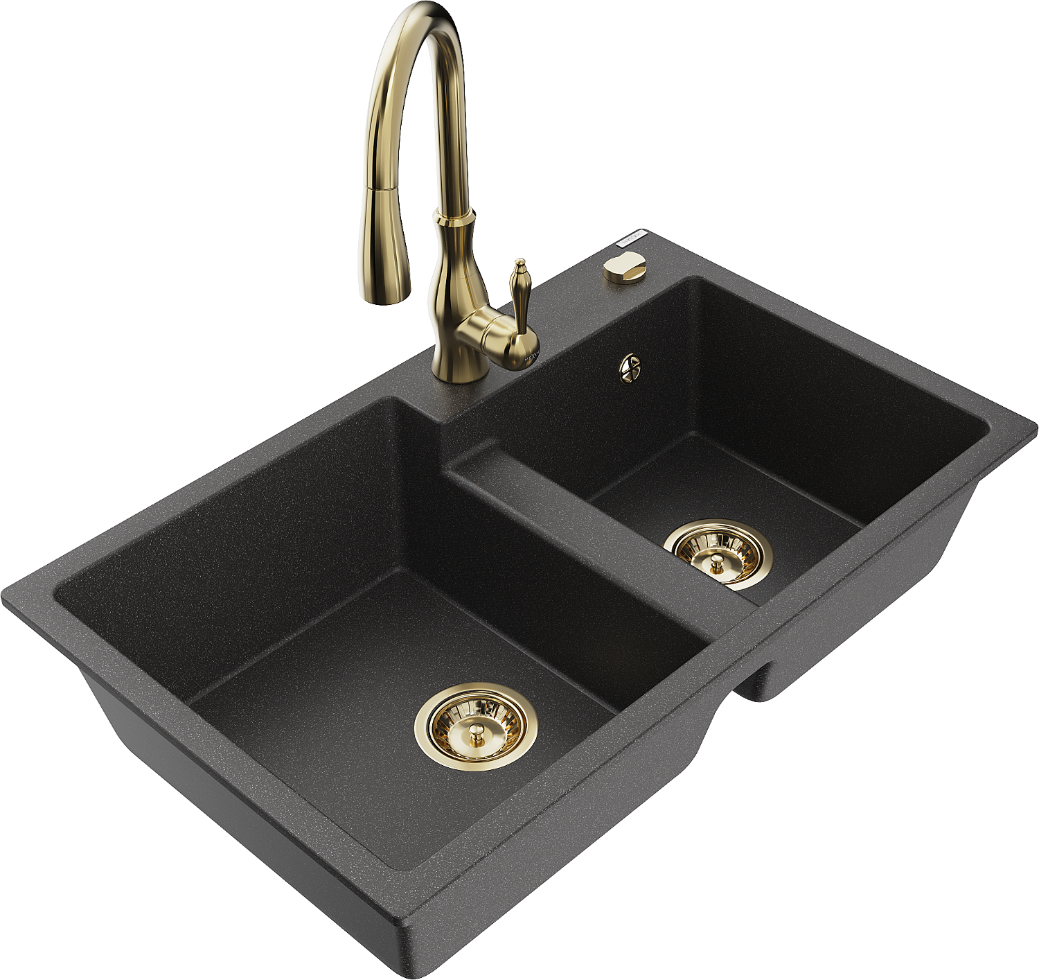 Mexen Tomas granit izlietne ar diviem nodalījumiem un virtuves jaucējkrānu Savita, melns ar punktiem - 6516-76-672601-50