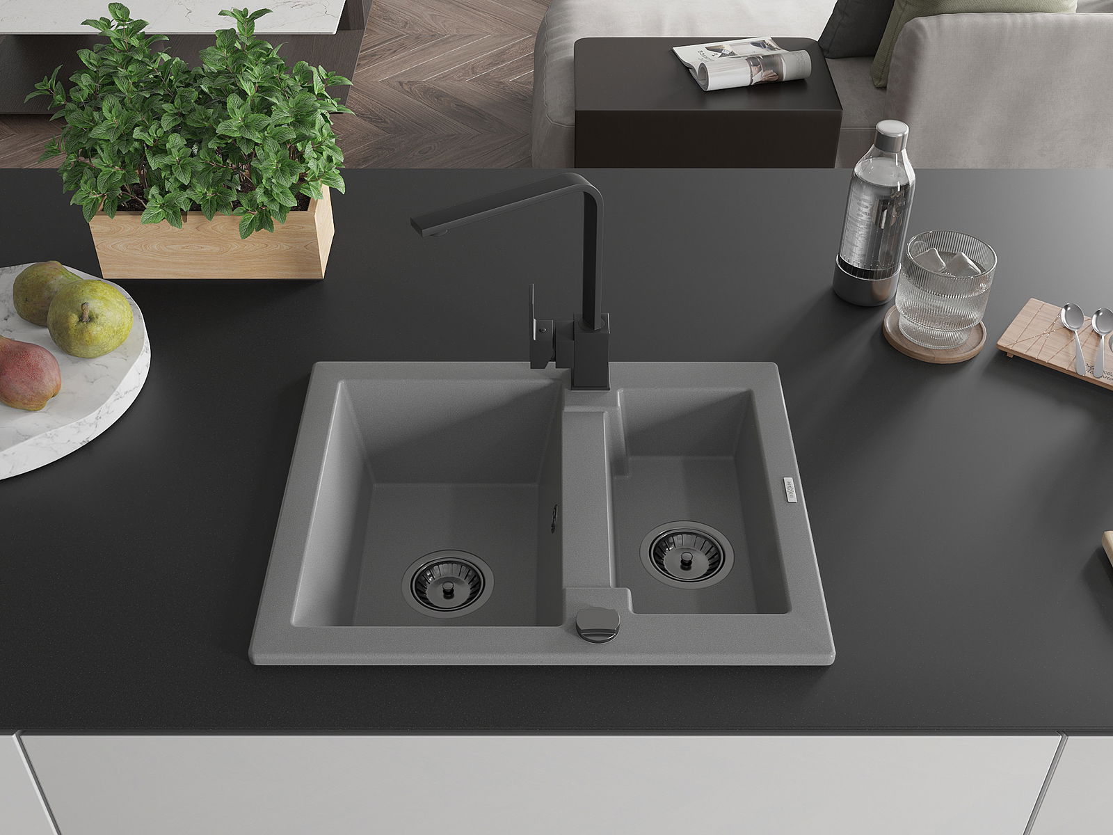 Mexen Carlos granitais izlietne ar 1,5 nodalījumiem un virtuves jaucējkrānu Rita, pelēka - 6518-71-670300-70-B