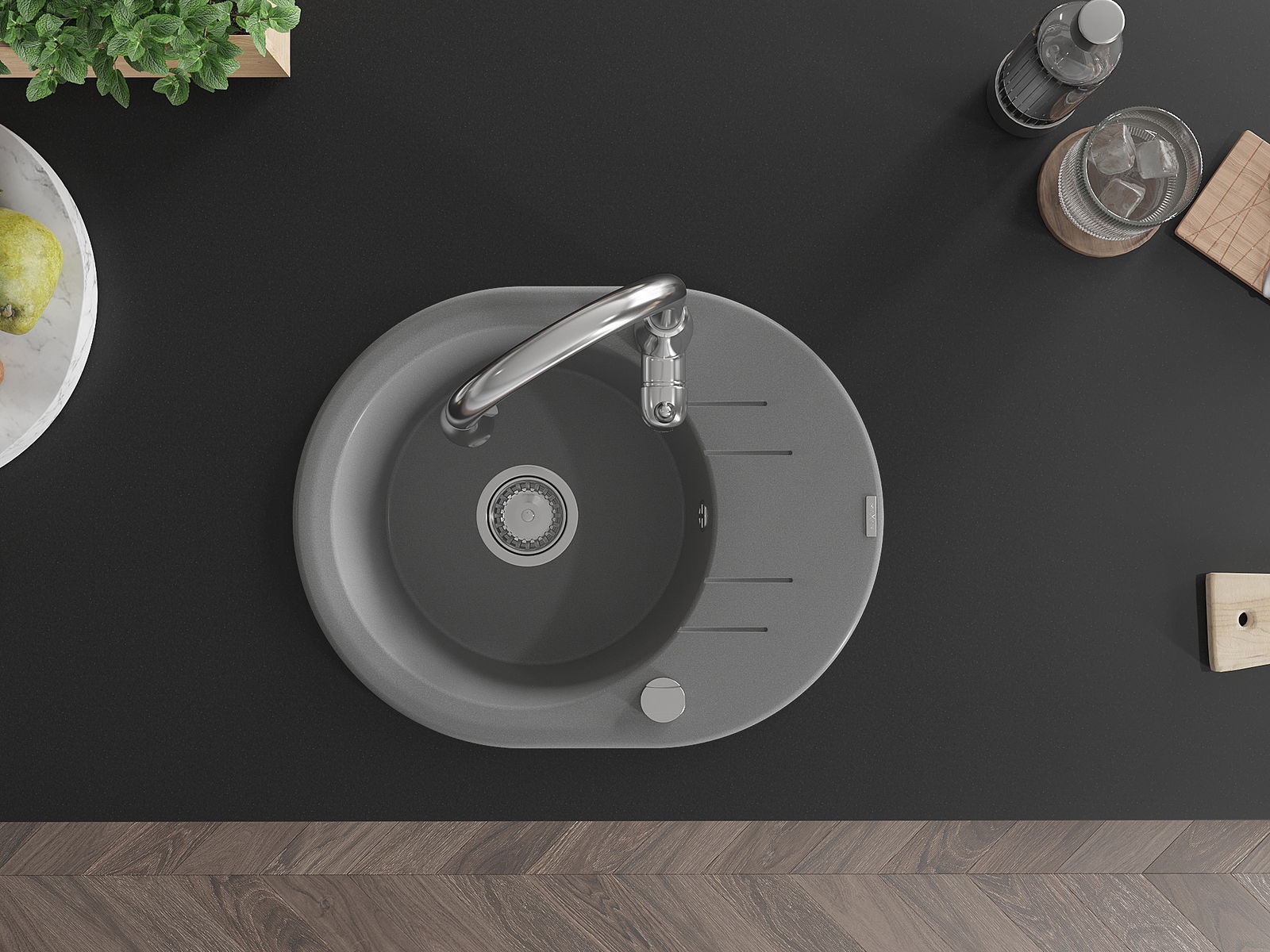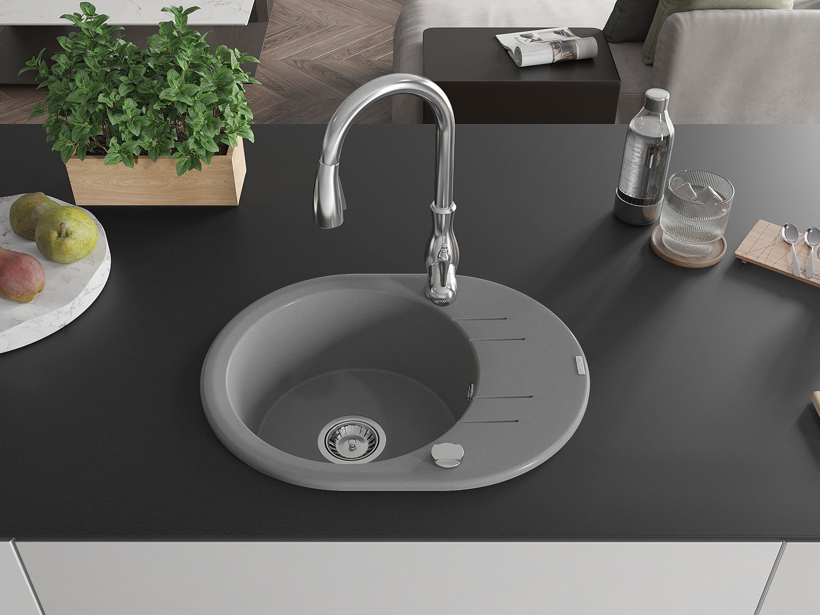 Mexen Kevin granīta izlietne ar vienu nodalījumu un noteces vietu, virtuves jaucējkrānu Savita, pelēks - 6517-71-672601-00