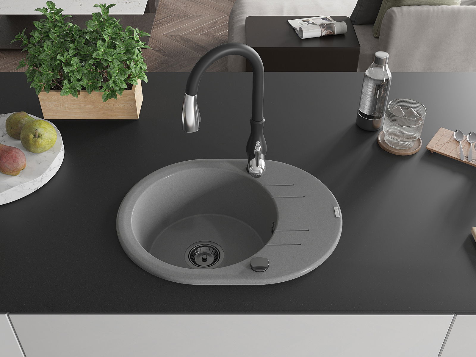 Mexen Kevin granitais izlietne ar vienu nodalījumu, noteces vietu un virtuves jaucējkrānu Savita, pelēka - 6517-71-672601-70-B