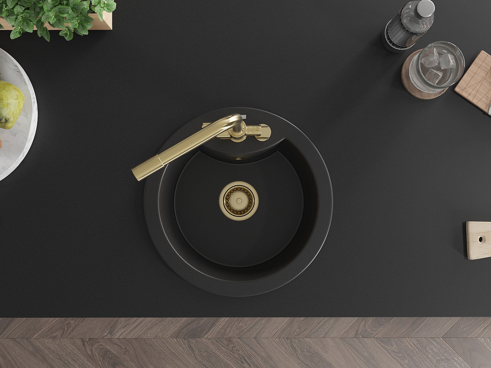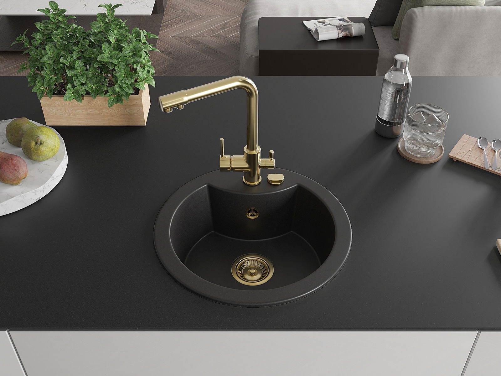 Izlietnei ir padziļināts caurums ar diametru 35 mm, kuru varat izsist patstāvīgi. To var izmantot, piemēram, šķidruma dozatora uzstādīšanai, kas novērsīs plastmasas pudeļu klātbūtni virtuvē un piešķirs tai elegantu apdari.