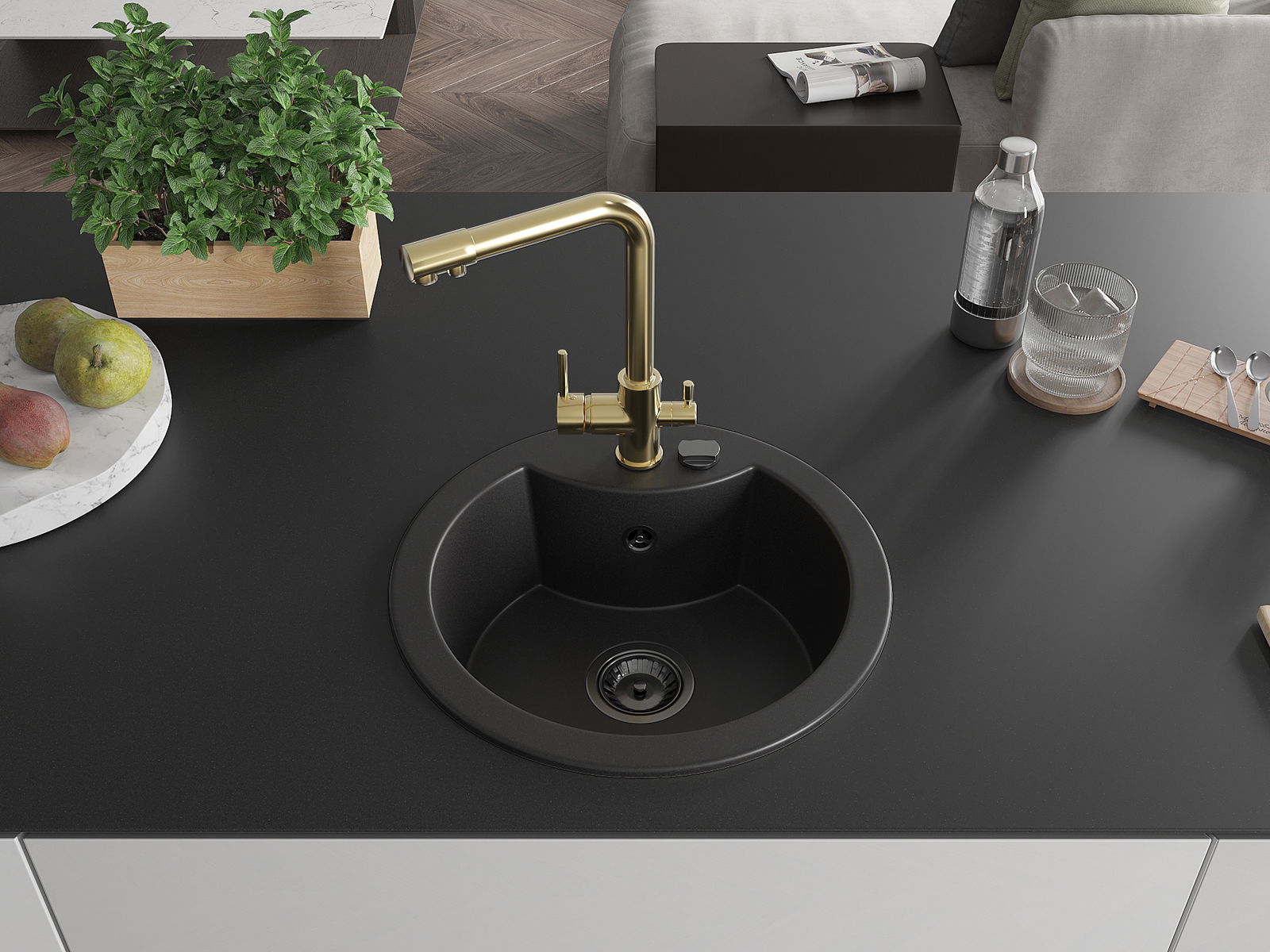 Izlietnei ir padziļināts caurums ar diametru 35 mm, kuru varat izsist patstāvīgi. To var izmantot, piemēram, šķidruma dozatora uzstādīšanai, kas novērsīs plastmasas pudeļu klātbūtni virtuvē un piešķirs tai elegantu apdari.