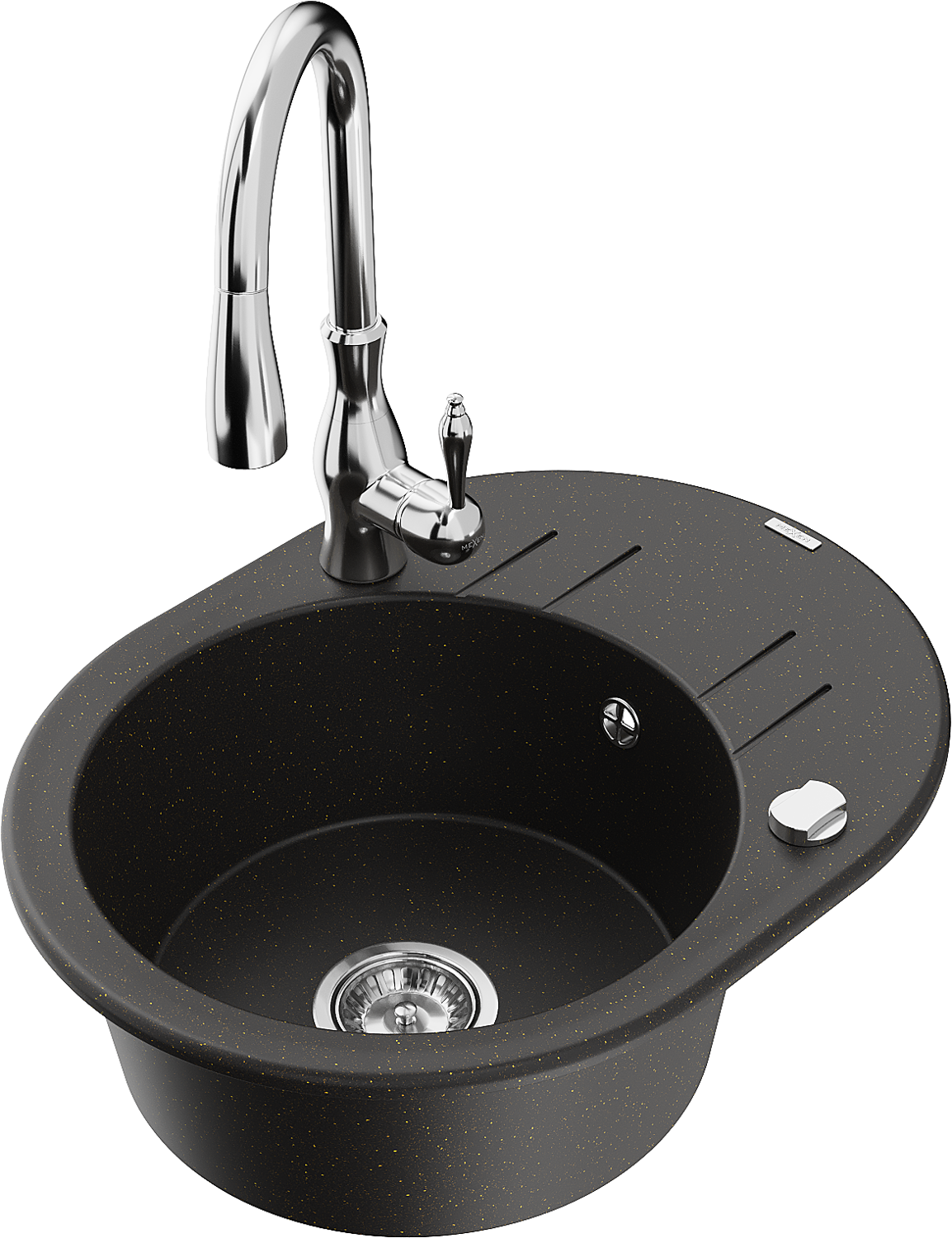 Mexen Kevin granīta izlietne ar vienu kameru, notekpaplāti un virtuves jaucējkrānu Savita, melns/zeltītais metālisks