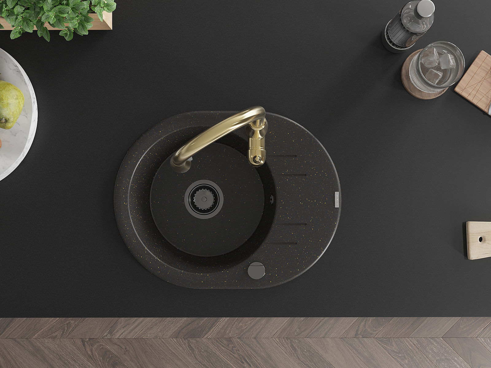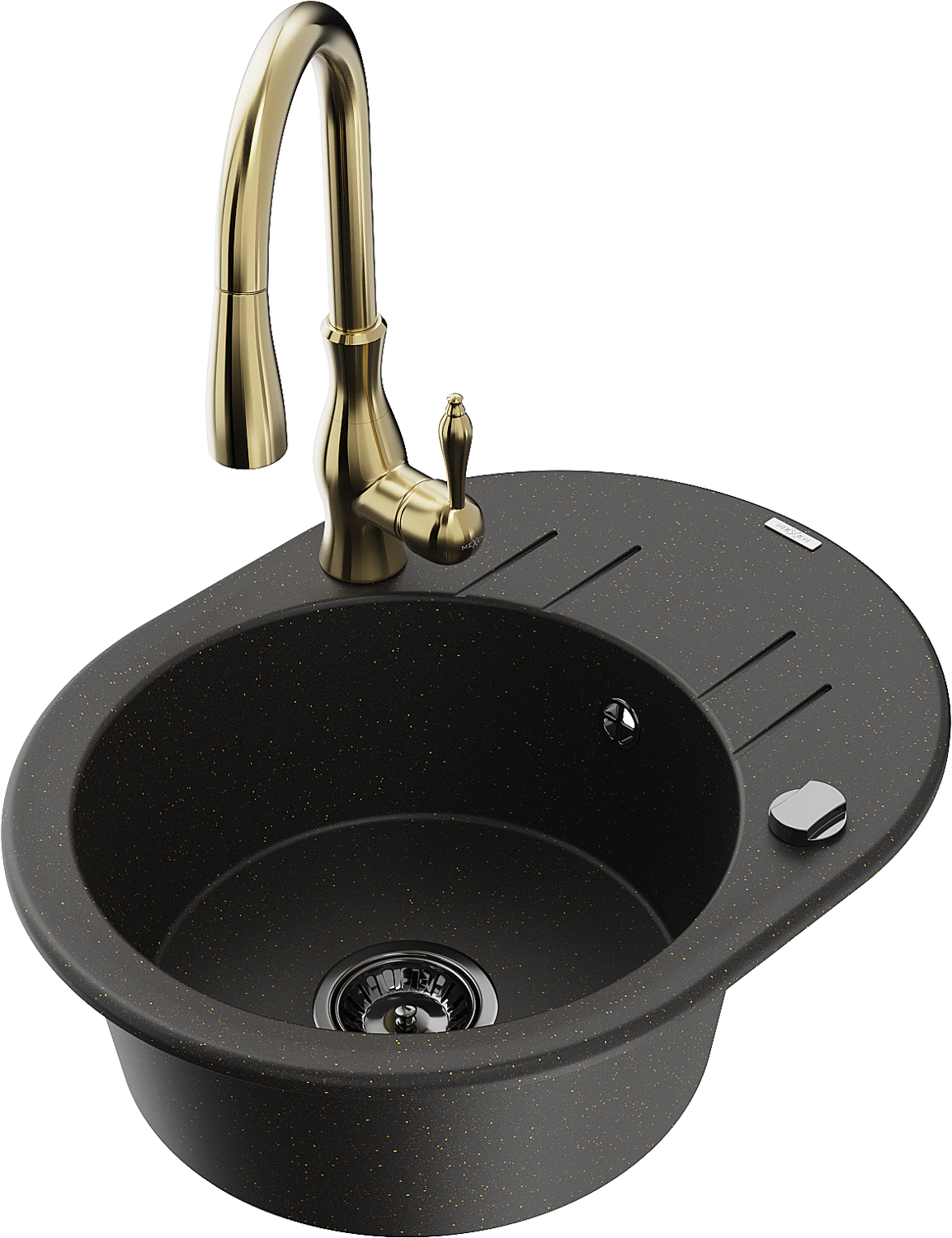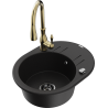 Mexen Kevin granitizlietne ar vienu nodalījumu ar noteces vietu un virtuves krānu Savita, melns/zelta metāliks