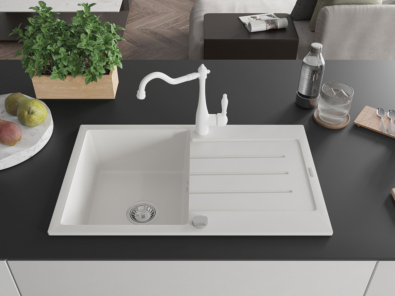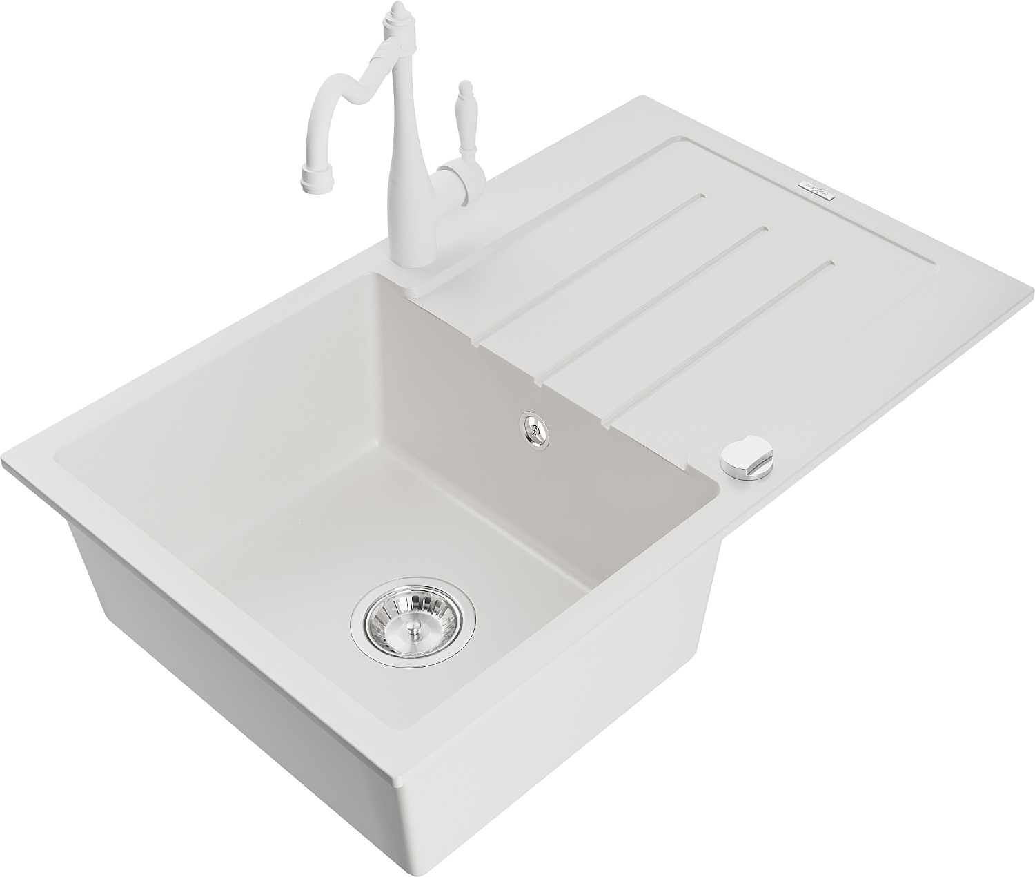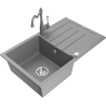 Mexen Bruno granitizlietne 1-nodalīta ar noteces plauktu un virtuves jaucējkrānu Carla, balts - 6513-20-670700-20
