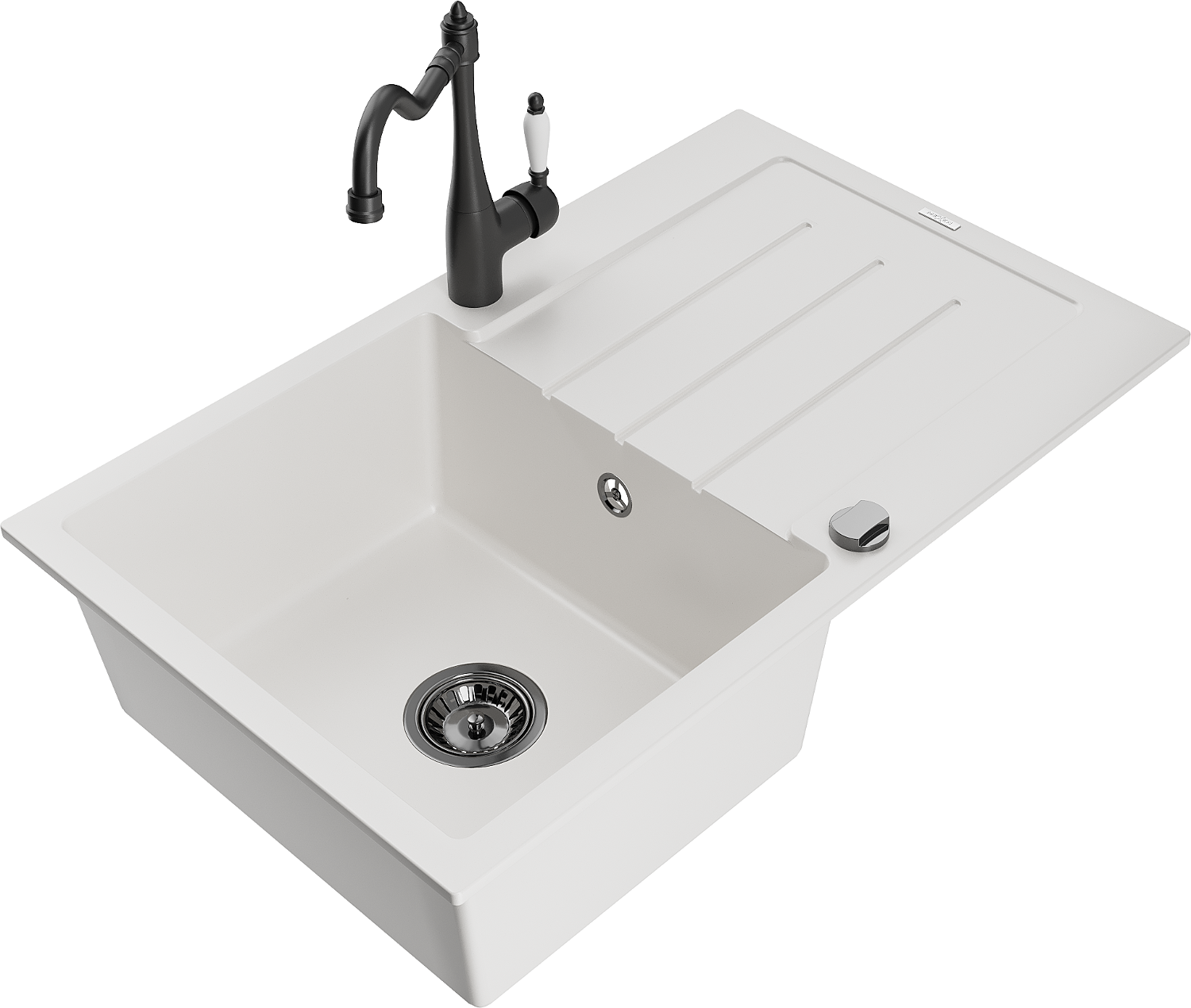 Mexen Bruno granīta izlietne ar vienu nodalījumu, noteces zonu un virtuves jaucējkrānu Carla, balta - 6513-20-670700-70