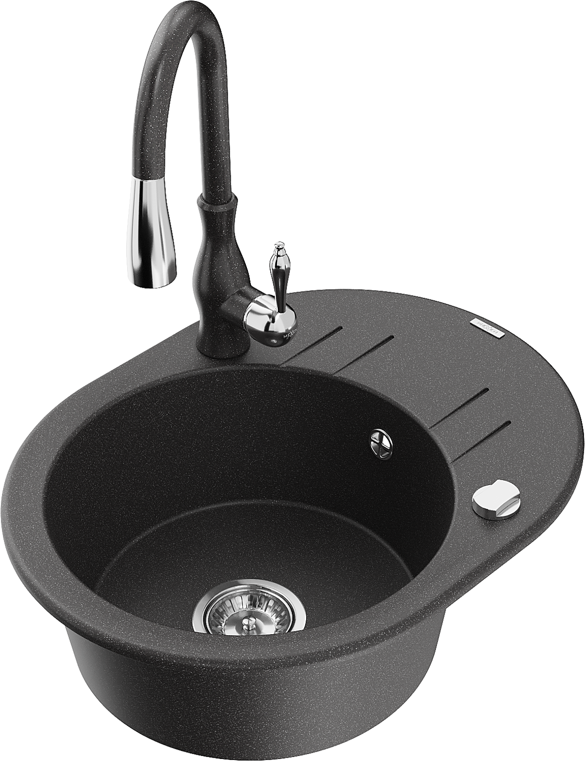 Mexen Kevin granitā izlietne 1 kameru ar noteces un virtuves jaucējkrānu Savita, melna plankumaina - 6517-76-672601-76