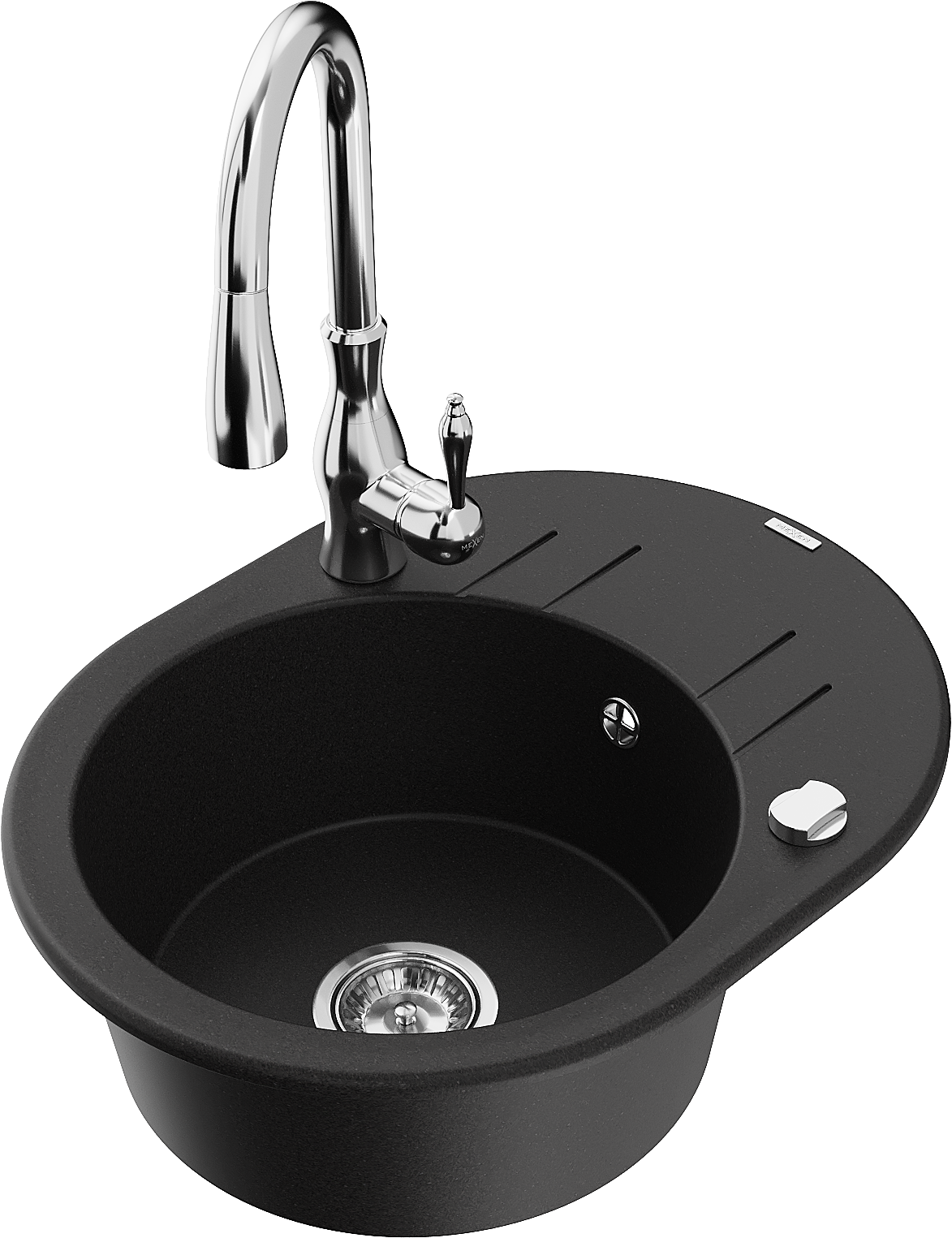 Mexen Kevin granitais izlietne ar vienu nodalījumu un iztekas plauktu un virtuves jaucējkrānu Savita, melns - 6517-77-672601-00