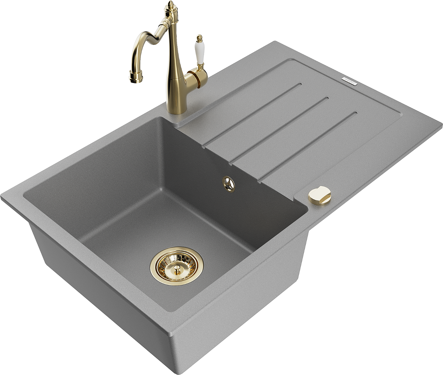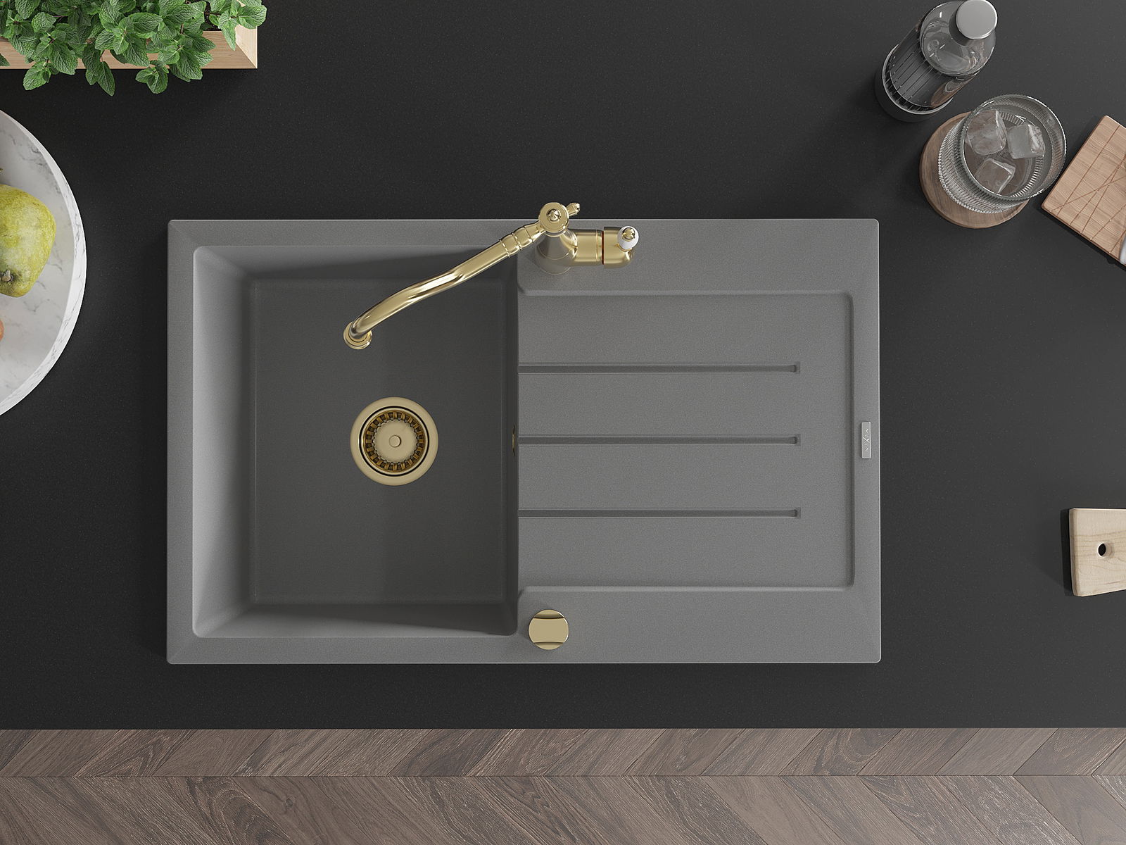 Mexen Bruno granitē izlietne ar vienu nodalījumu ar žāvētāju un virtuves jaucējkrānu Carla, pelēka - 6513-71-670700-50