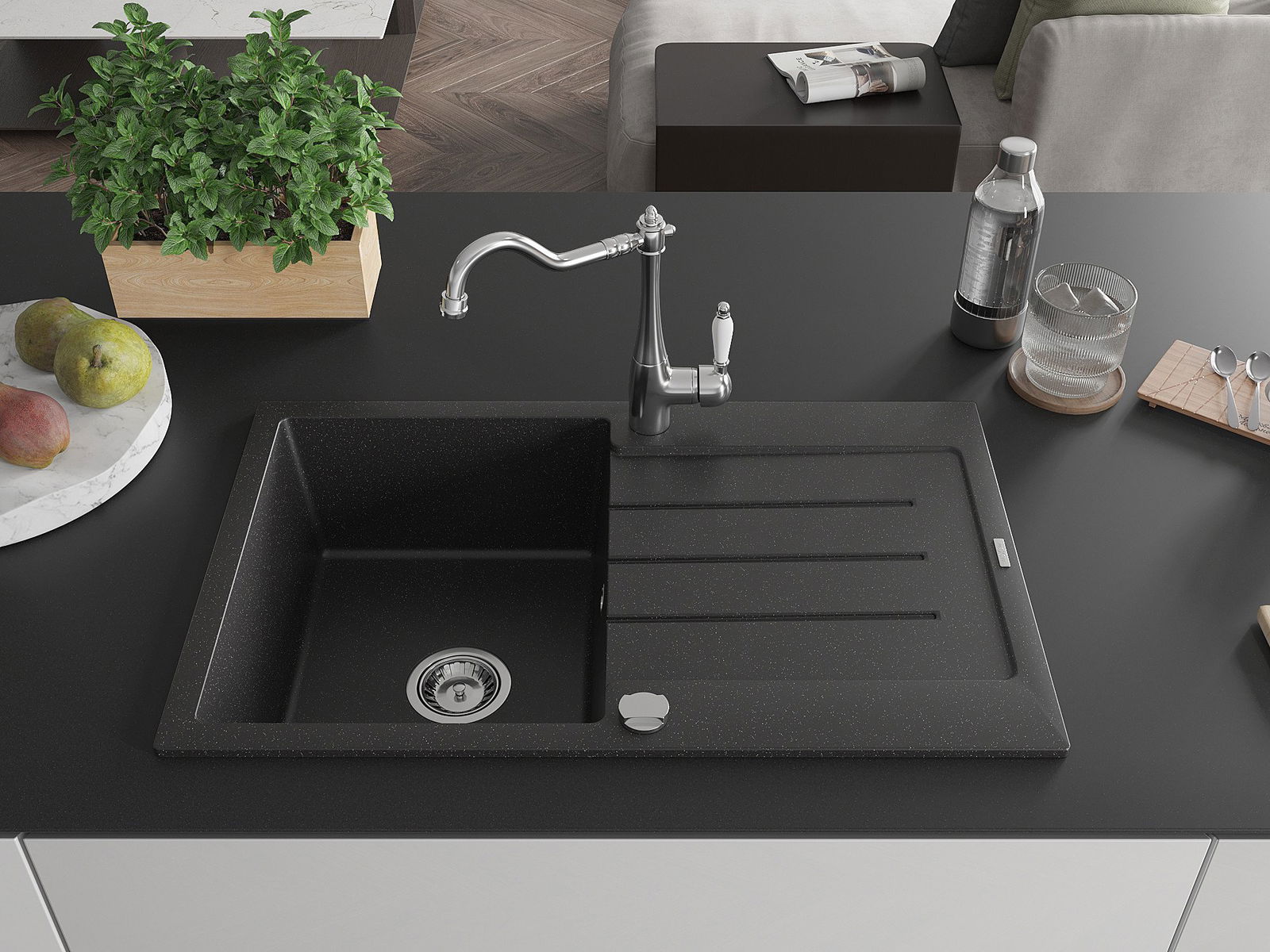 Mexen Bruno granitizlietne ar vienu nodalījumu ar noteku un virtuves jaucējkrānu Carla, melns/sudraba metālisks