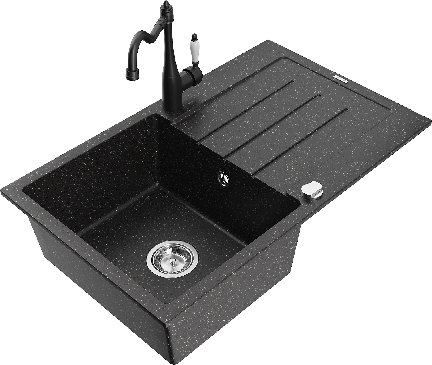 Mexen Bruno granitizlietne ar 1 nodalījumu, notecinātāju un virtuves jaucējkrānu Carla, melns/sudraba metāliskais