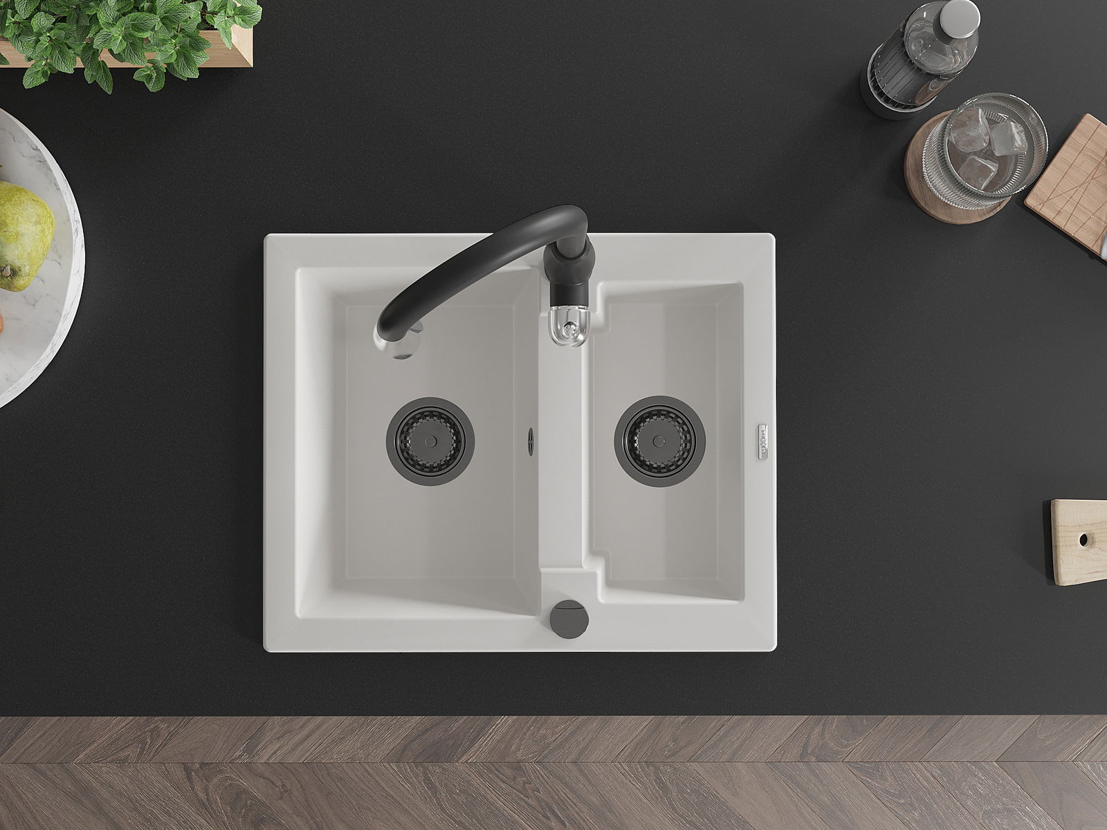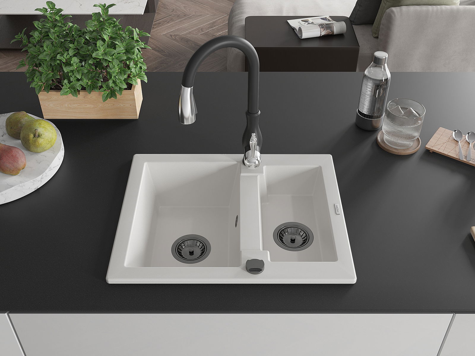 Mexen Carlos granīta izlietne 1,5 nodalījuma ar virtuves maisītāju Savita, balta - 6518-20-672601-70