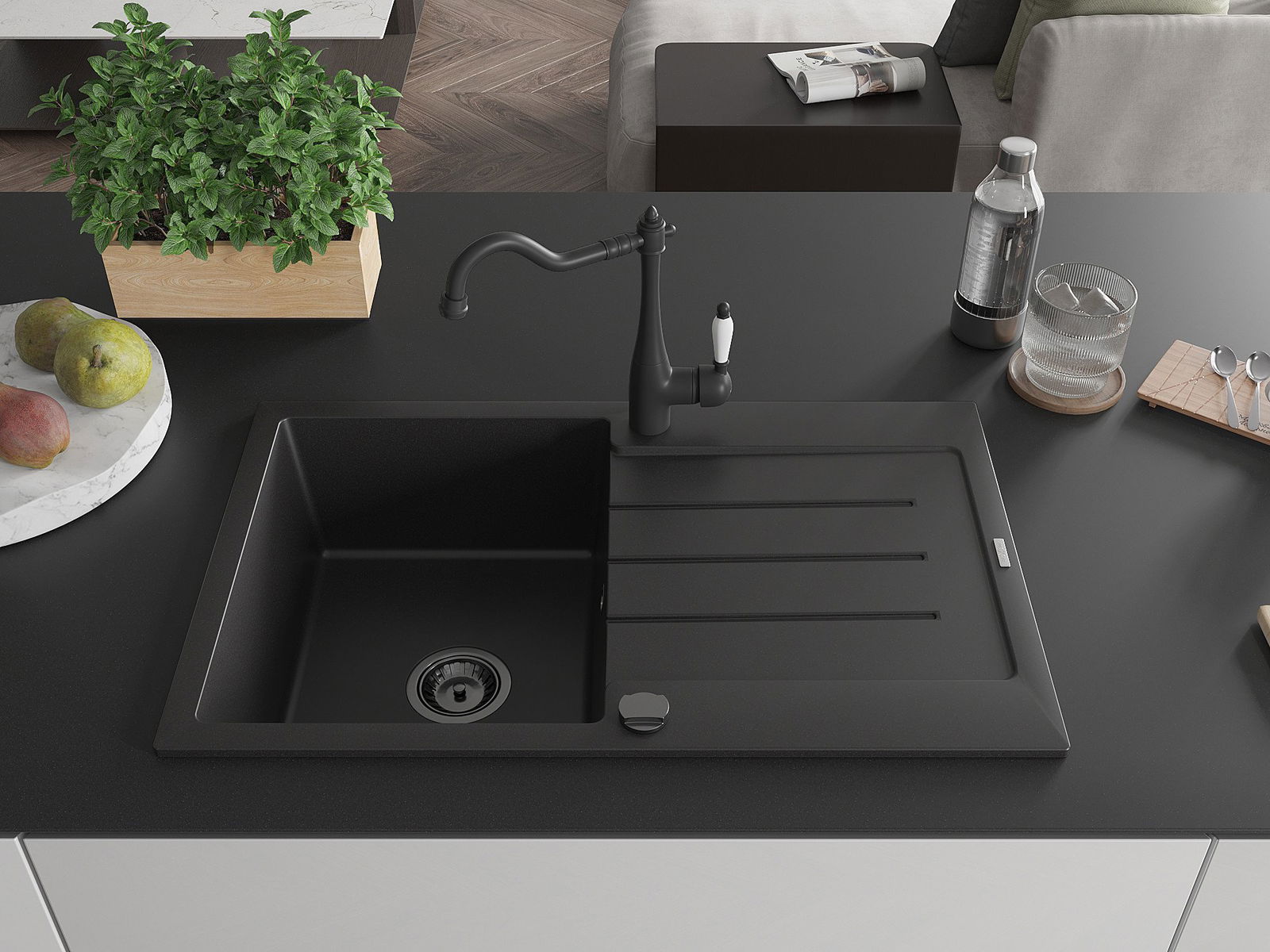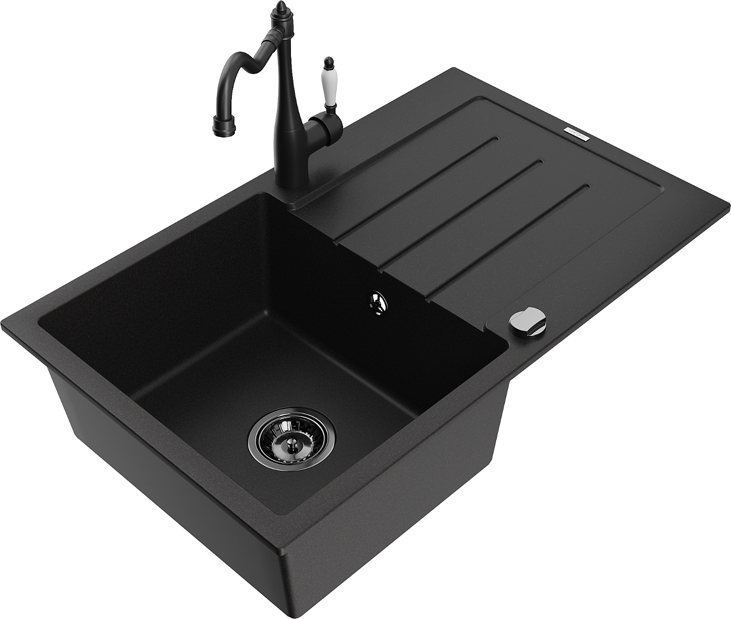 Mexen Bruno granitais izlietne ar vienu nodalījumu ar noteku un virtuvēm jaucējkrānu Carla, melna - 6513-77-670700-70-B