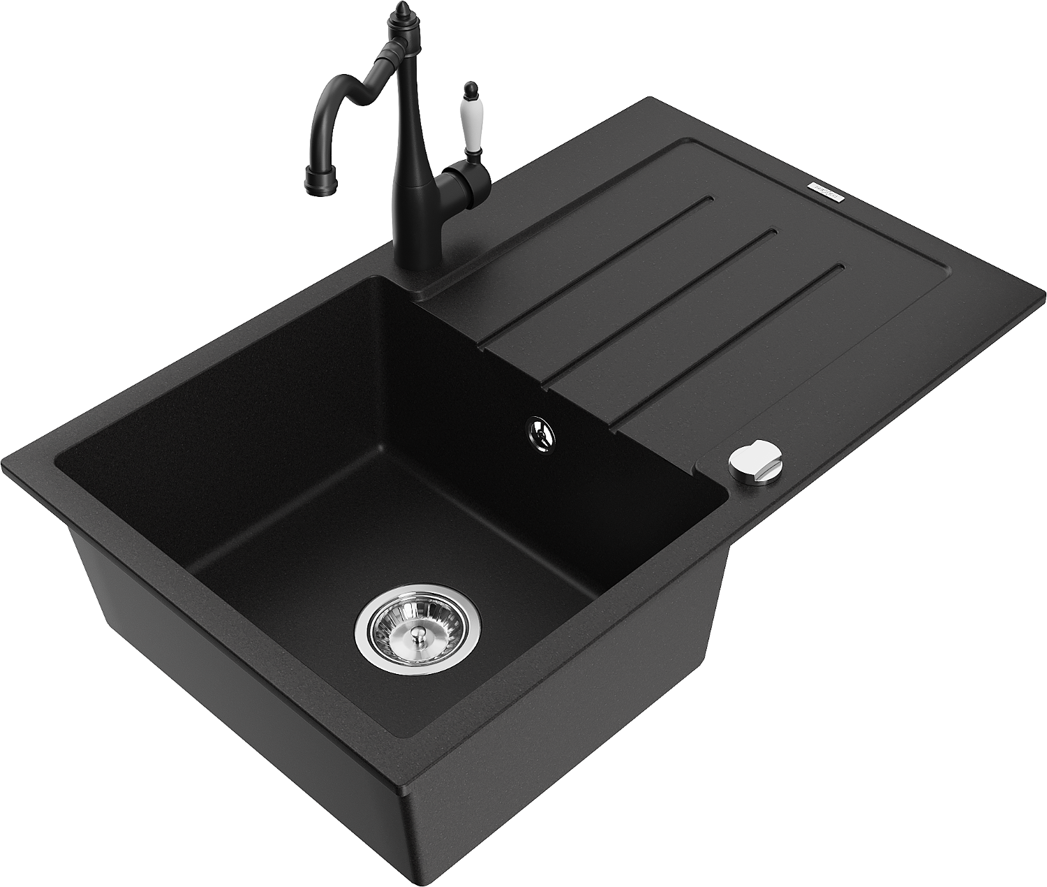 Mexen Bruno granit izlietne ar vienu nodalījumu ar noteces vietu un virtuves jaucējkrānu Carla, melns - 6513-77-670700-70