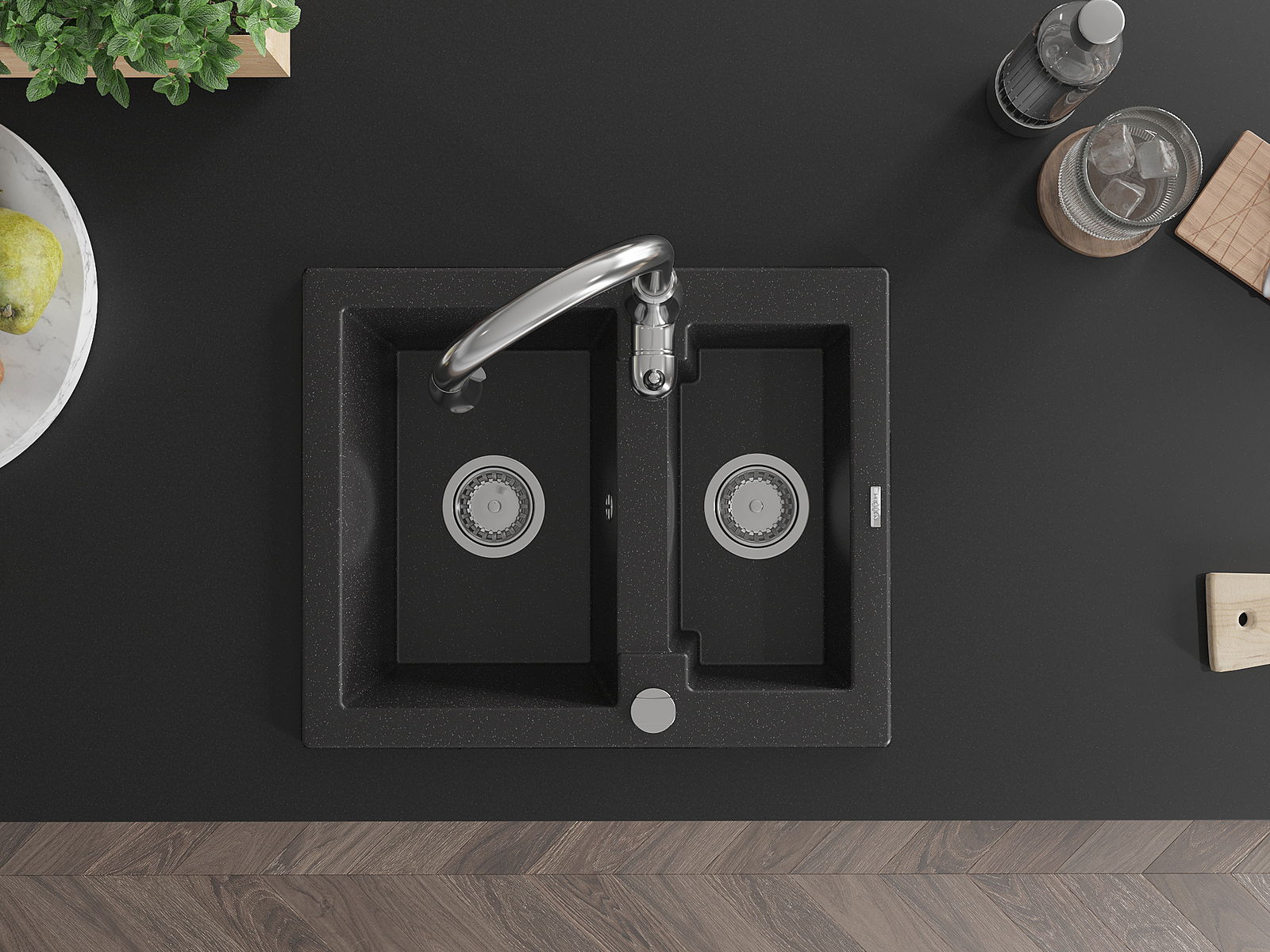 Mexen Carlos granitē izlietne ar 1,5 nodalījumiem un virtuves krānu Savita, melns/sudraba metālisks - 6518-73-672601-00