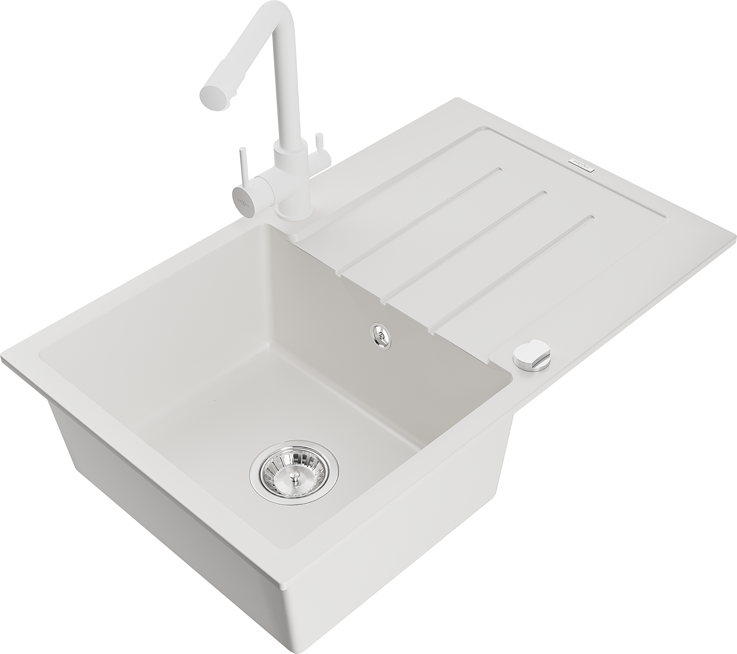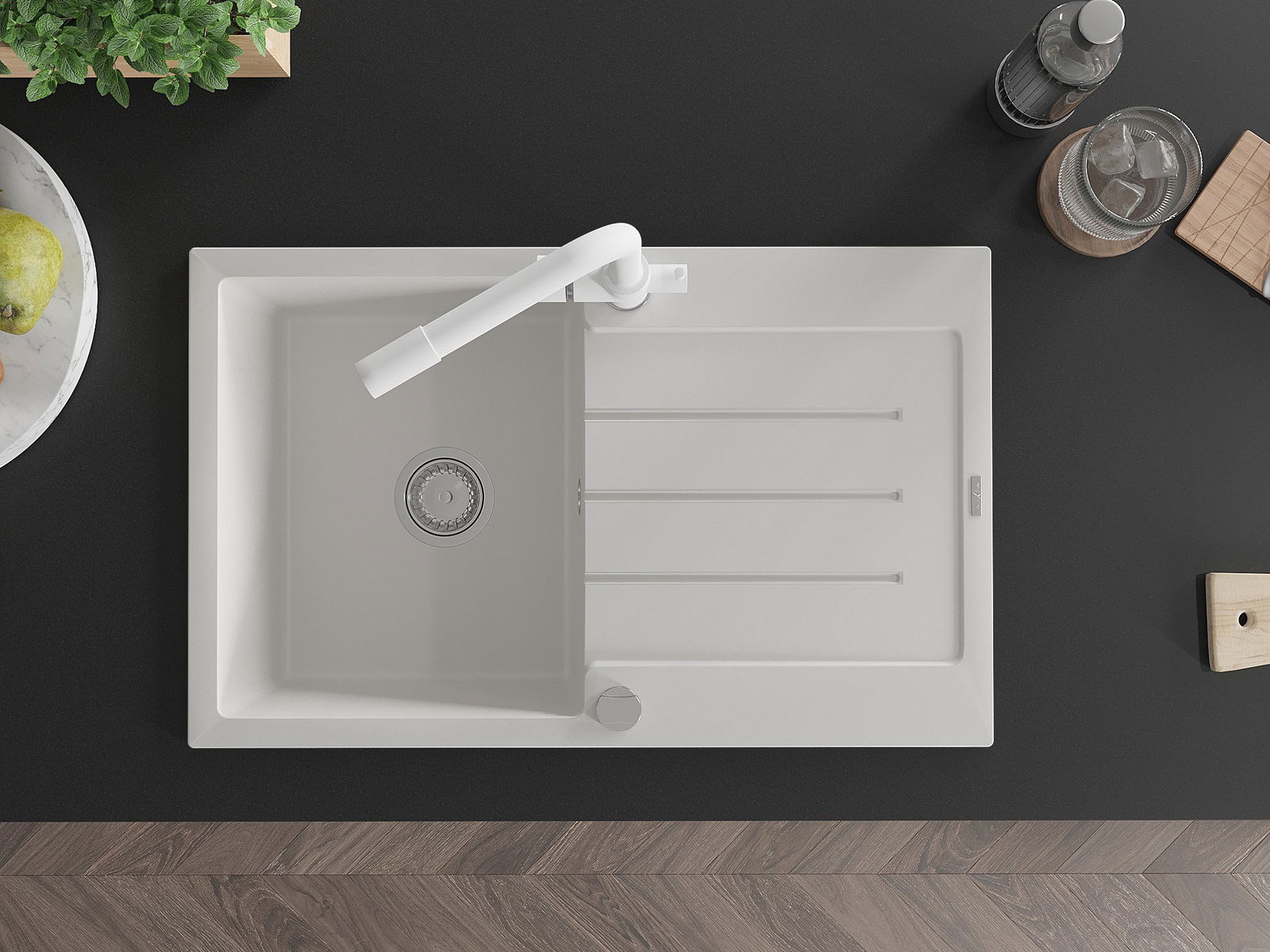 Mexen Bruno granitais izlietne ar vienu nodalījumu, notekpaliktni un virtuves jaucējkrānu Duero, balts - 6513-20-671600-20