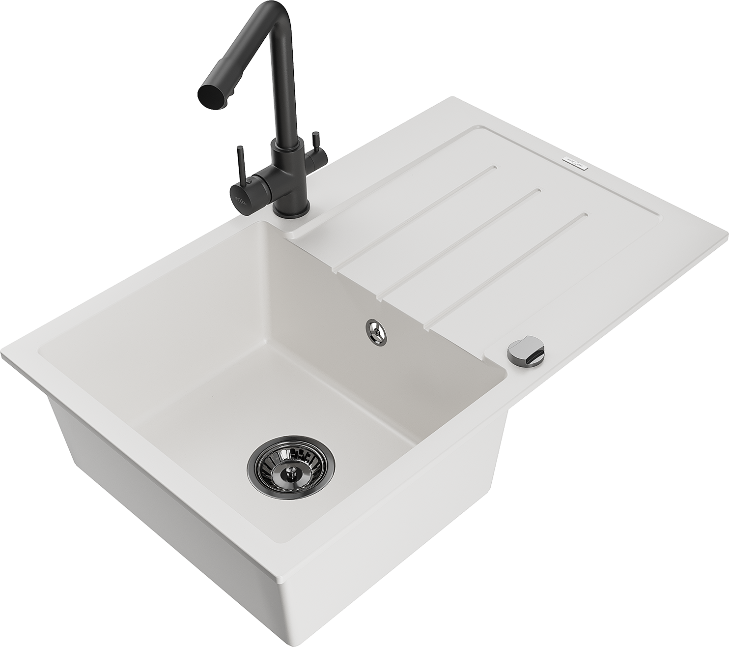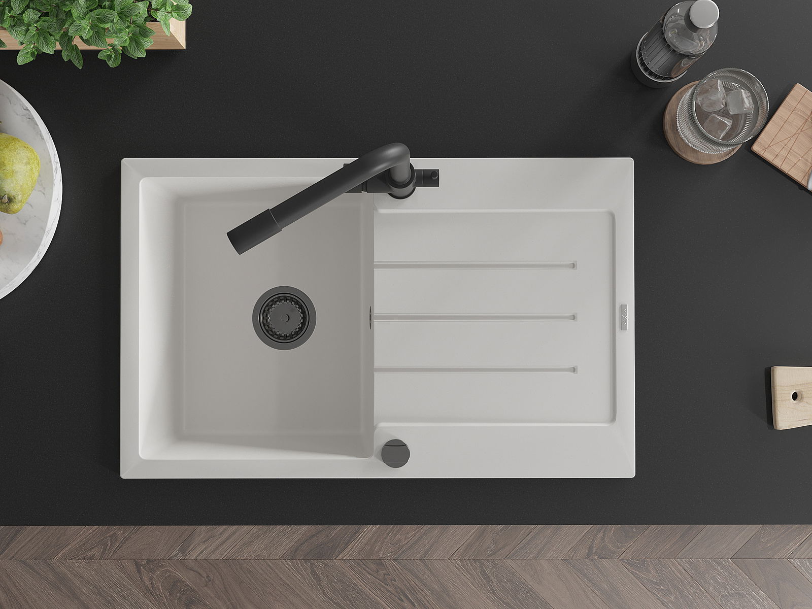 Mexen Bruno granīta izlietne ar vienu nodalījumu un noteces zonu un virtuves jaucējkrānu Duero, balta - 6513-20-671600-70