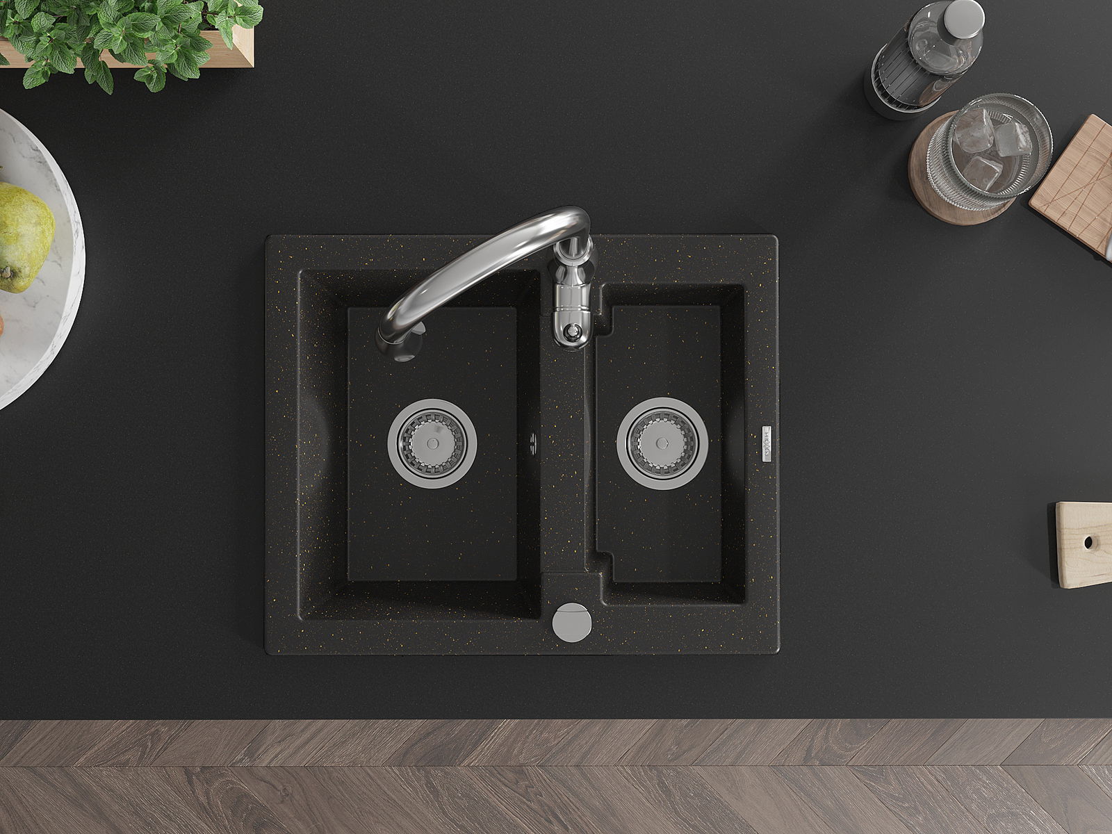 Mexen Carlos 1,5 nodalījuma granīta izlietne ar virtuves jaucējkrānu Savita, melna/zeltīta metālika - 6518-75-672601-00