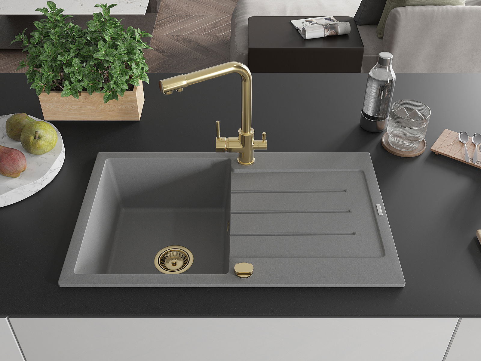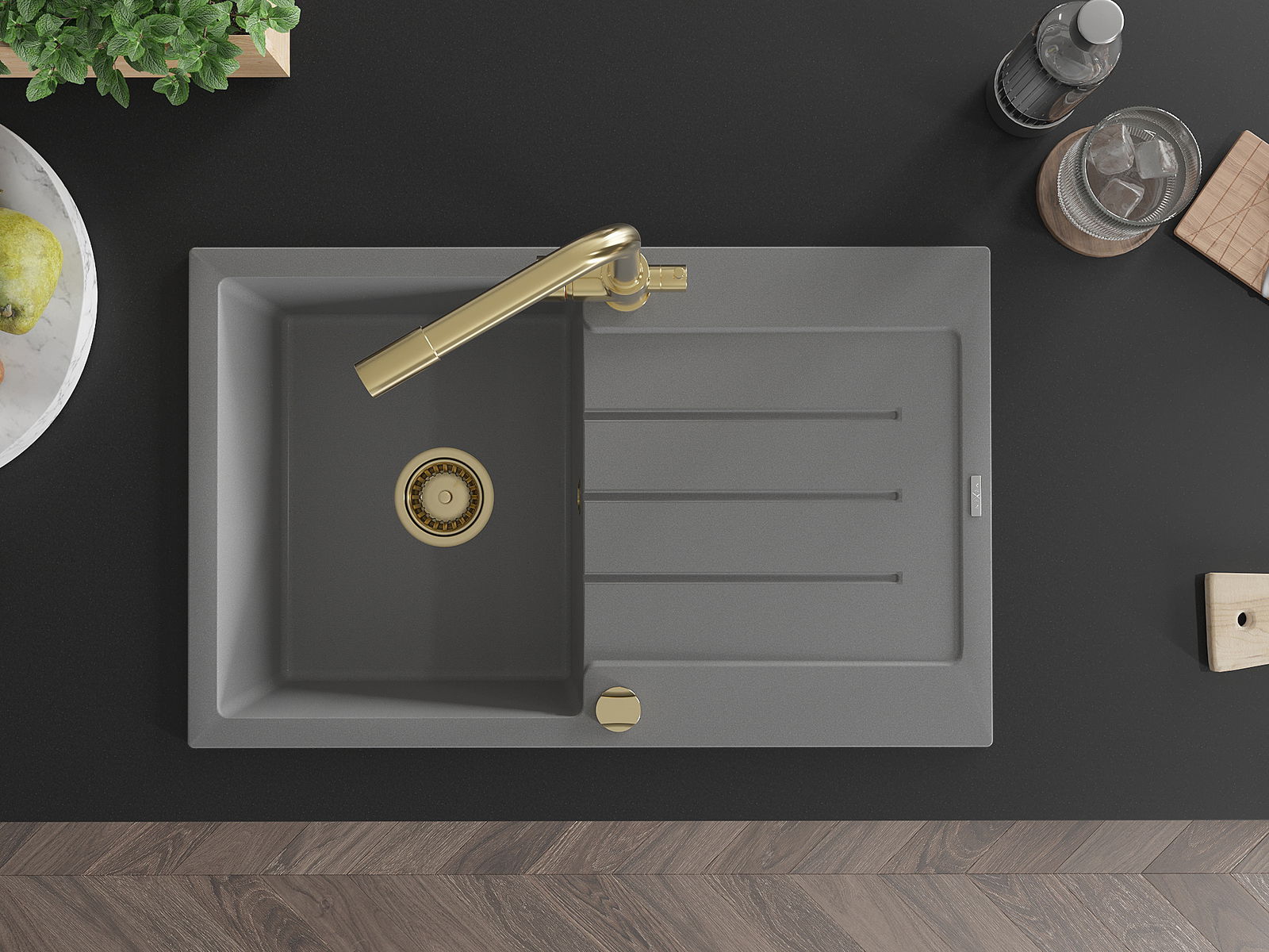 Mexen Bruno Granit izlietne ar vienu nodalījumu, pilošu paneli un virtuves jaucējkrānu Duero, pelēka - 6513-71-671600-50