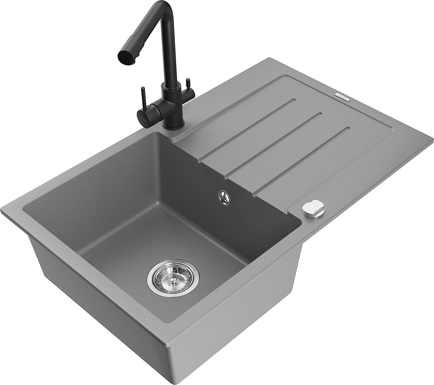 Mexen Bruno granitā izlietne ar vienu nodalījumu, novadni un virtuves jaucējkrānu Duero, pelēka - 6513-71-671600-70