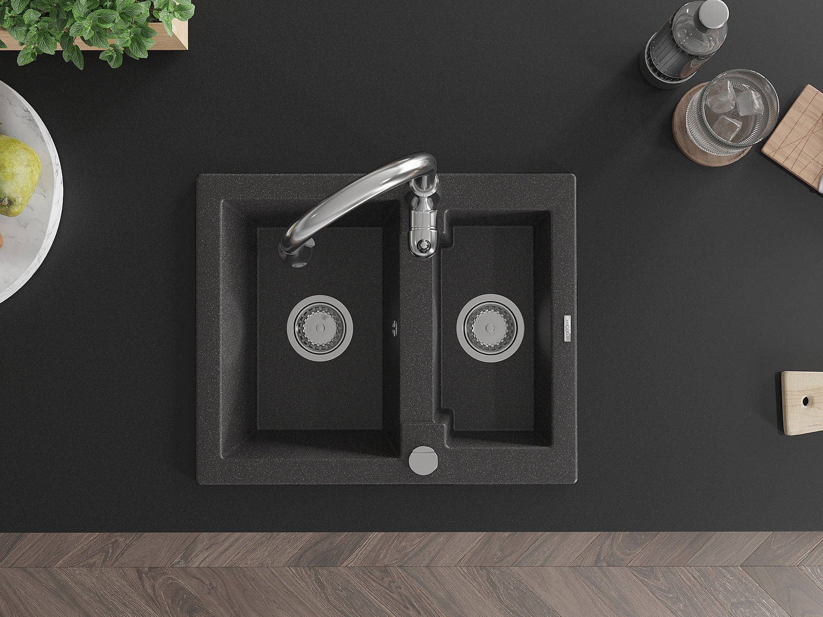 Mexen Carlos granitizlietne 1,5 nodalīts ar virtuvstes jaucējkrānu Savita, melns ar punktiem - 6518-76-672601-00