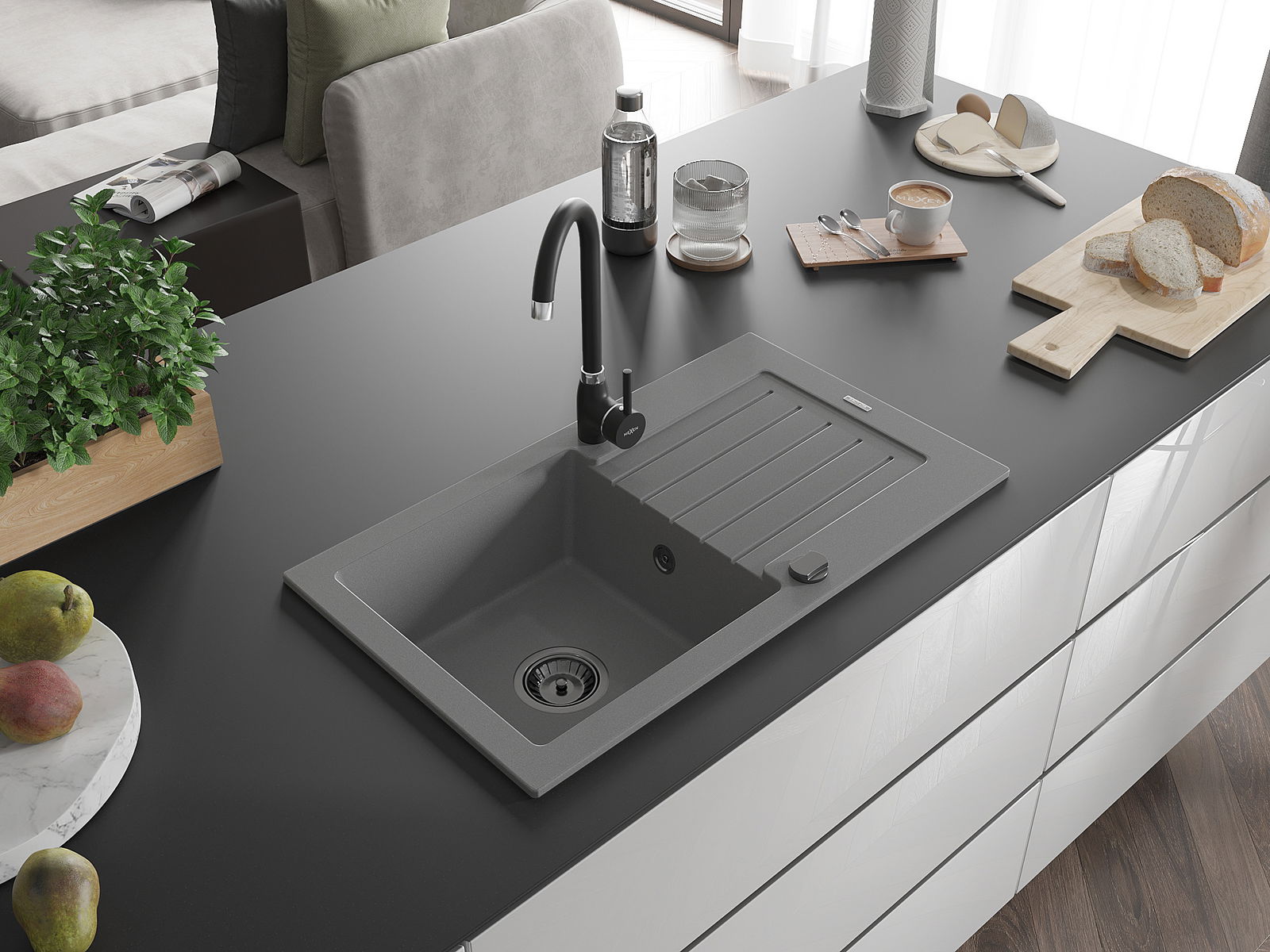 Mexen Pablo granit izlietne ar 1 nodalījumu un noteci un virtuvs jaucējkrānu Telma, pelēka - 6510-71-670200-70-B