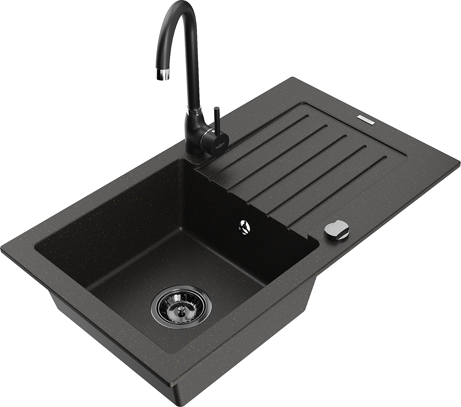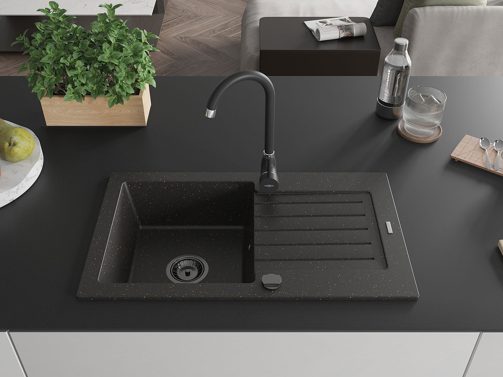 Mexen Pablo granitizlietne 1 nodalījuma ar noteci un virtuves jaucējkrānu Telma, melns/zeltains - 6510-75-670200-70-B