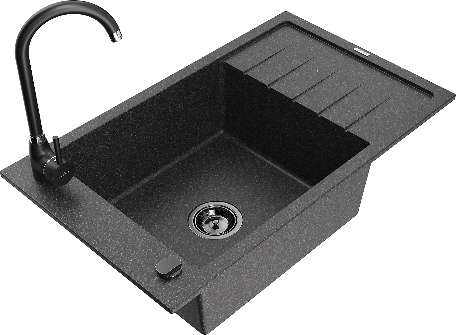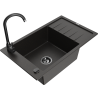 Mexen Elias granitā izlietne ar vienu nodalījumu un notecēšanas vietu, un Telma virtuves jaucējkrānu, melna ar plankumiem