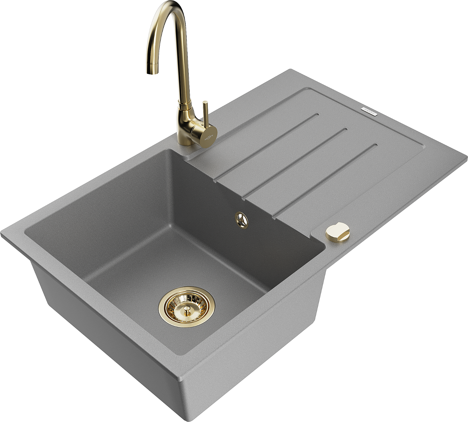 Mexen Bruno granīta izlietne ar vienu nodalījumu un noteces zonu, ar virtuves jaucējkrānu Telma, pelēka - 6513-71-670200-50