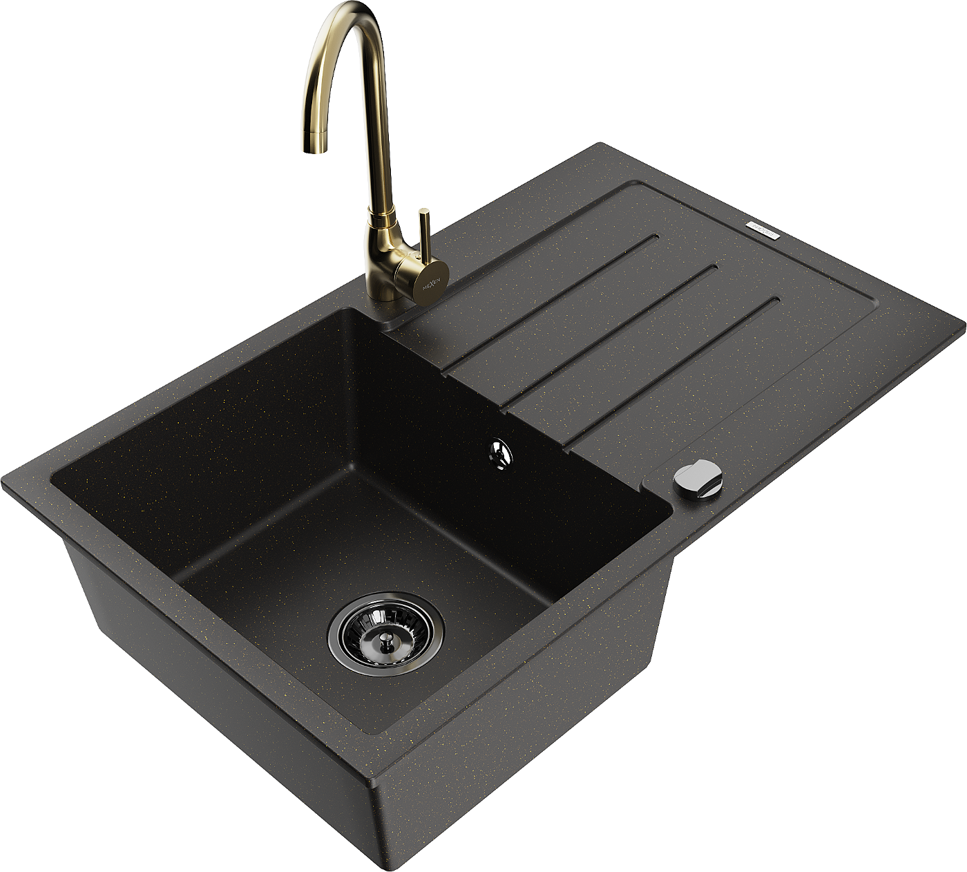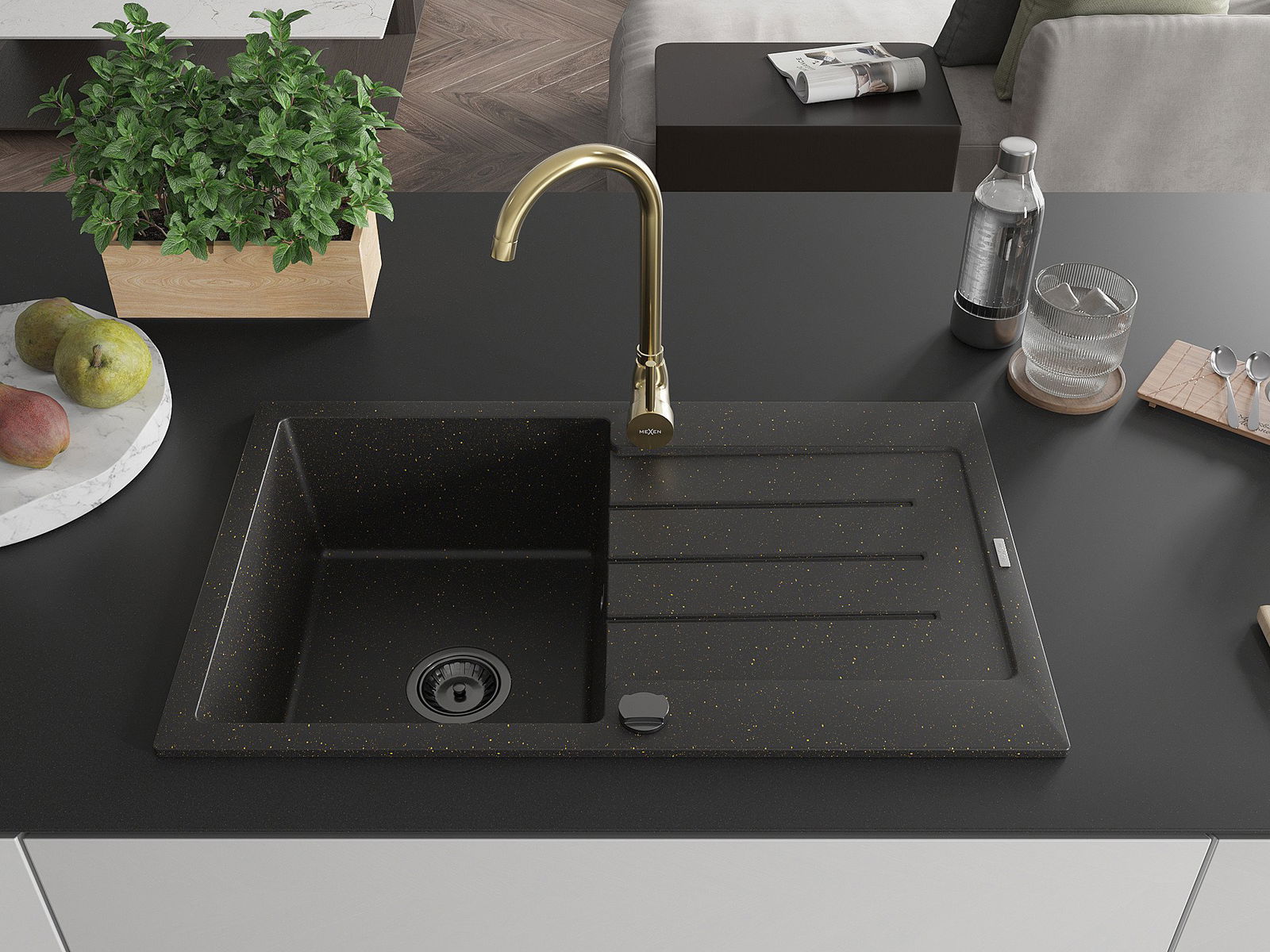 Mexen Bruno granīta izlietne ar vienu nodalījumu un noteces virsmu un virtuves jaucējkrānu Telma, melna/zelta
