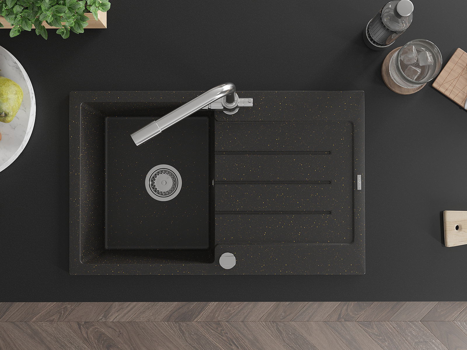 Mexen Bruno granitizlietne ar vienu nodalījumu ar notecinātāju un virtuves maisītāju Duero, melns/zelta metālika