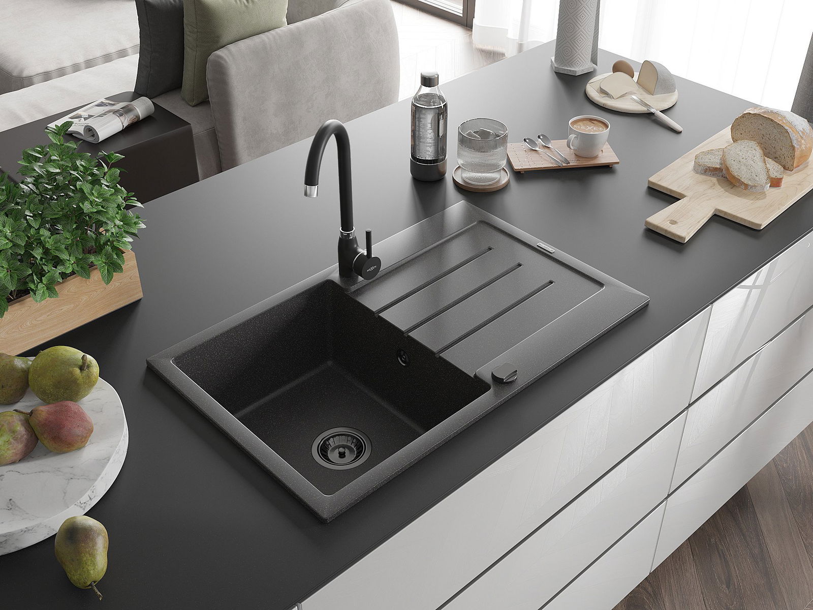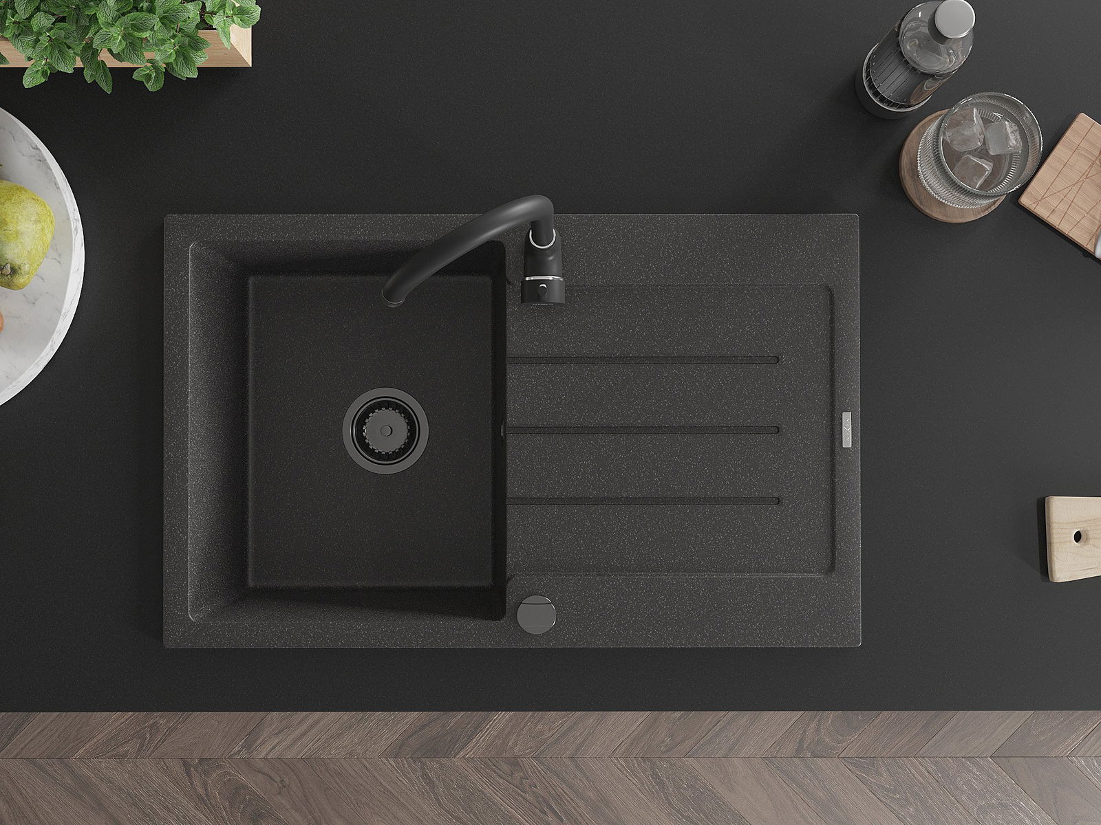 Mexen Bruno 1-kameras granīta izlietne ar notecējumu un virtuves jaucējkrānu Telma, melna ar izšļakstījumiem