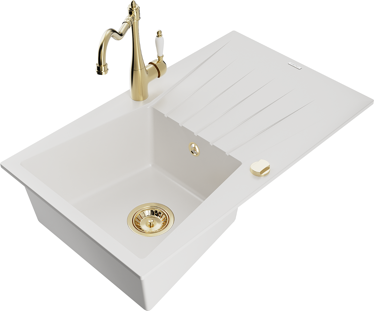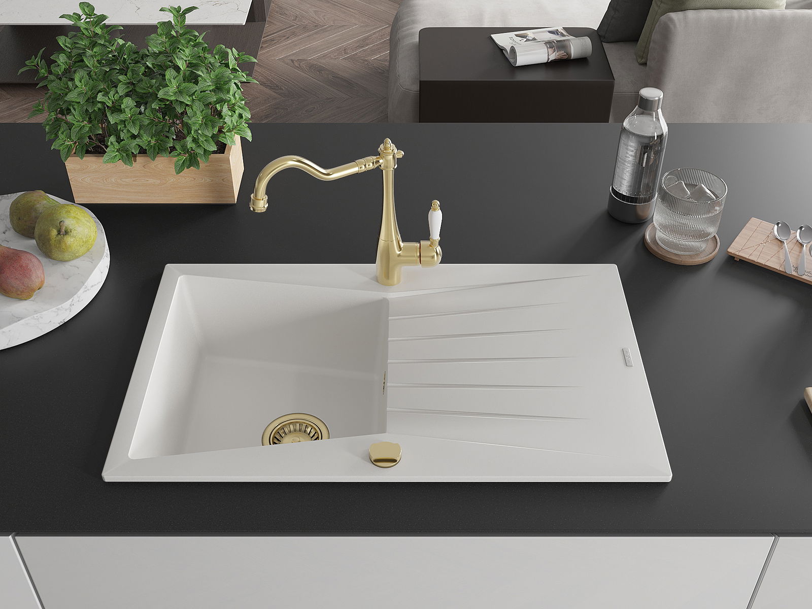 Mexen Cesar granīta izlietne ar vienu nodalījumu, noteces un virtuves jaucējkrānu Carla, balta - 6514-20-670700-50