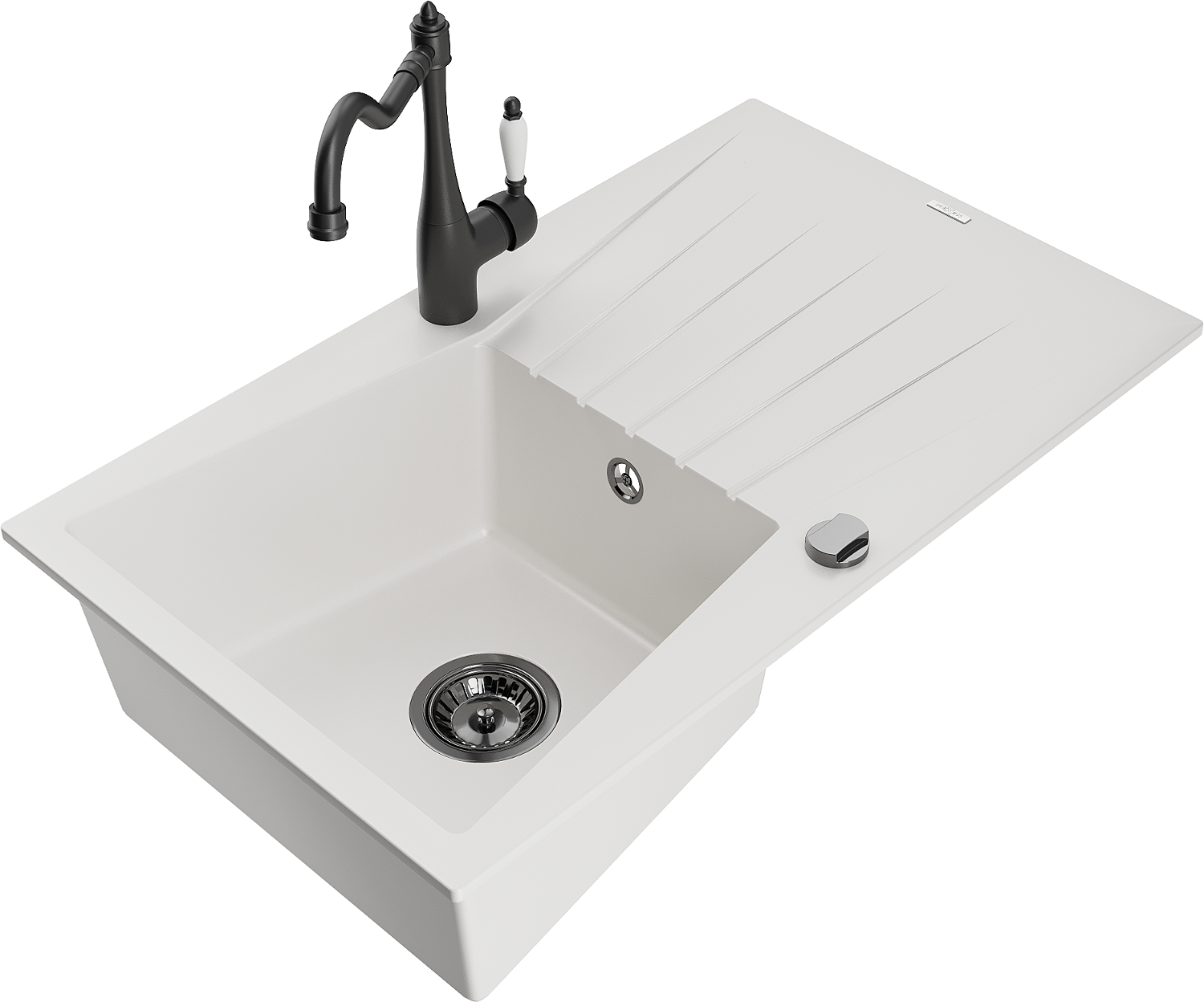 Mexen Cesar 1 kameru granīta izlietne ar noteces plati un virtuves jaucējkrānu Carla, balta - 6514-20-670700-70