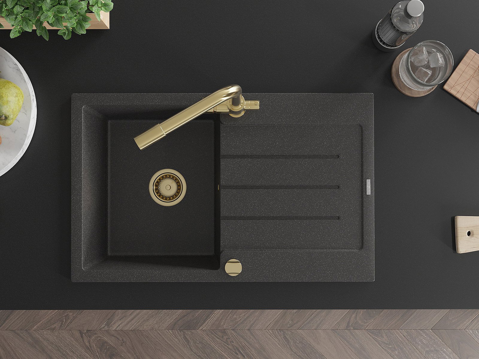 Izlietnei ir 2 daļēji izurbtas atveres ar diametru 35 mm, kuras var pašrocīgi izsist. Tās var izmantot, piemēram, šķidruma dozatora uzstādīšanai, kas novērsīs plastmasas pudeļu klātbūtni virtuvē un piešķirs tai elegantu apdari.