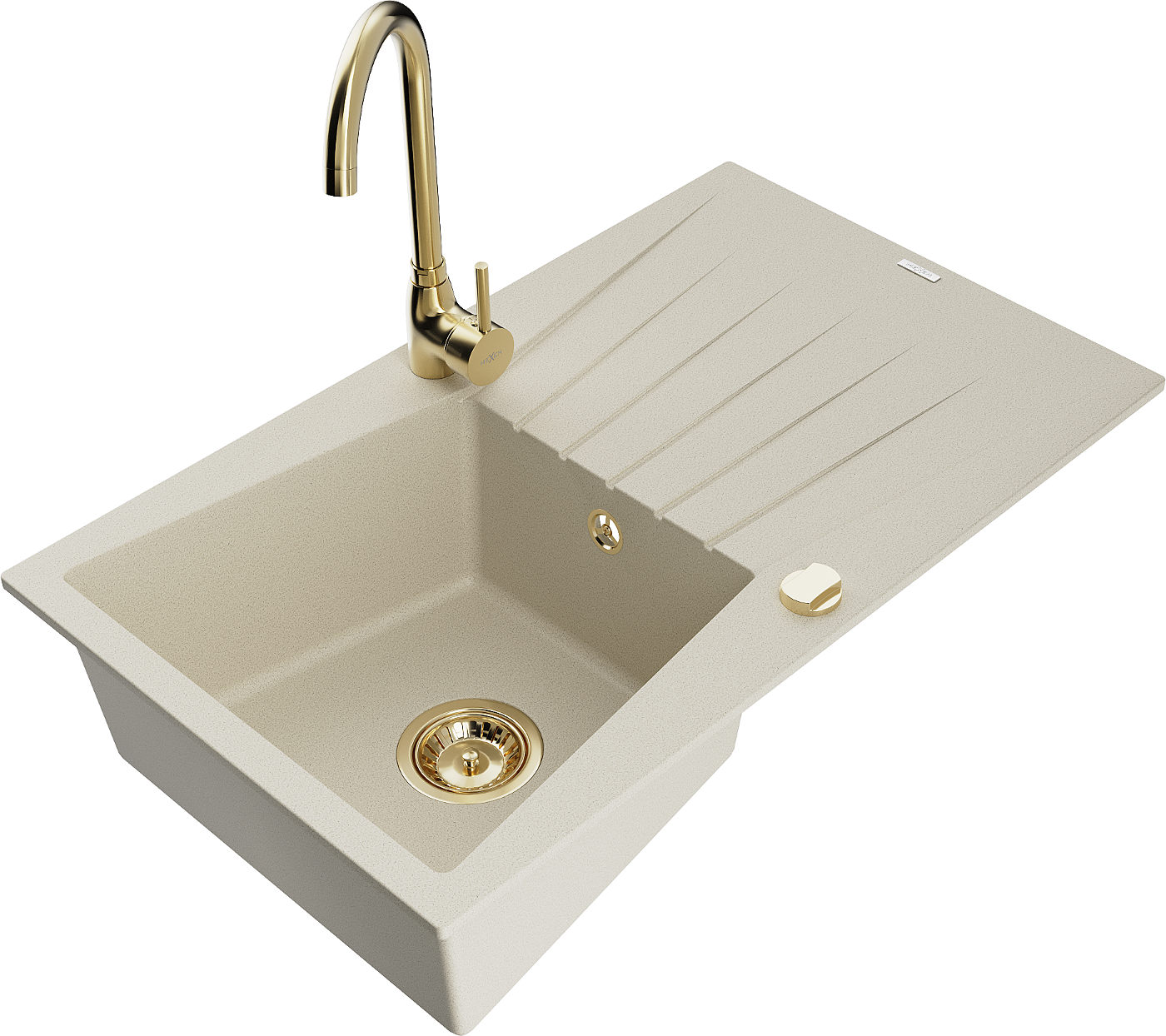 Mexen Cesar granitā izlietne ar vienu nodalījumu, noteces paneli un virtuves jaucējkrānu Telma, bēša - 6514-69-670200-50
