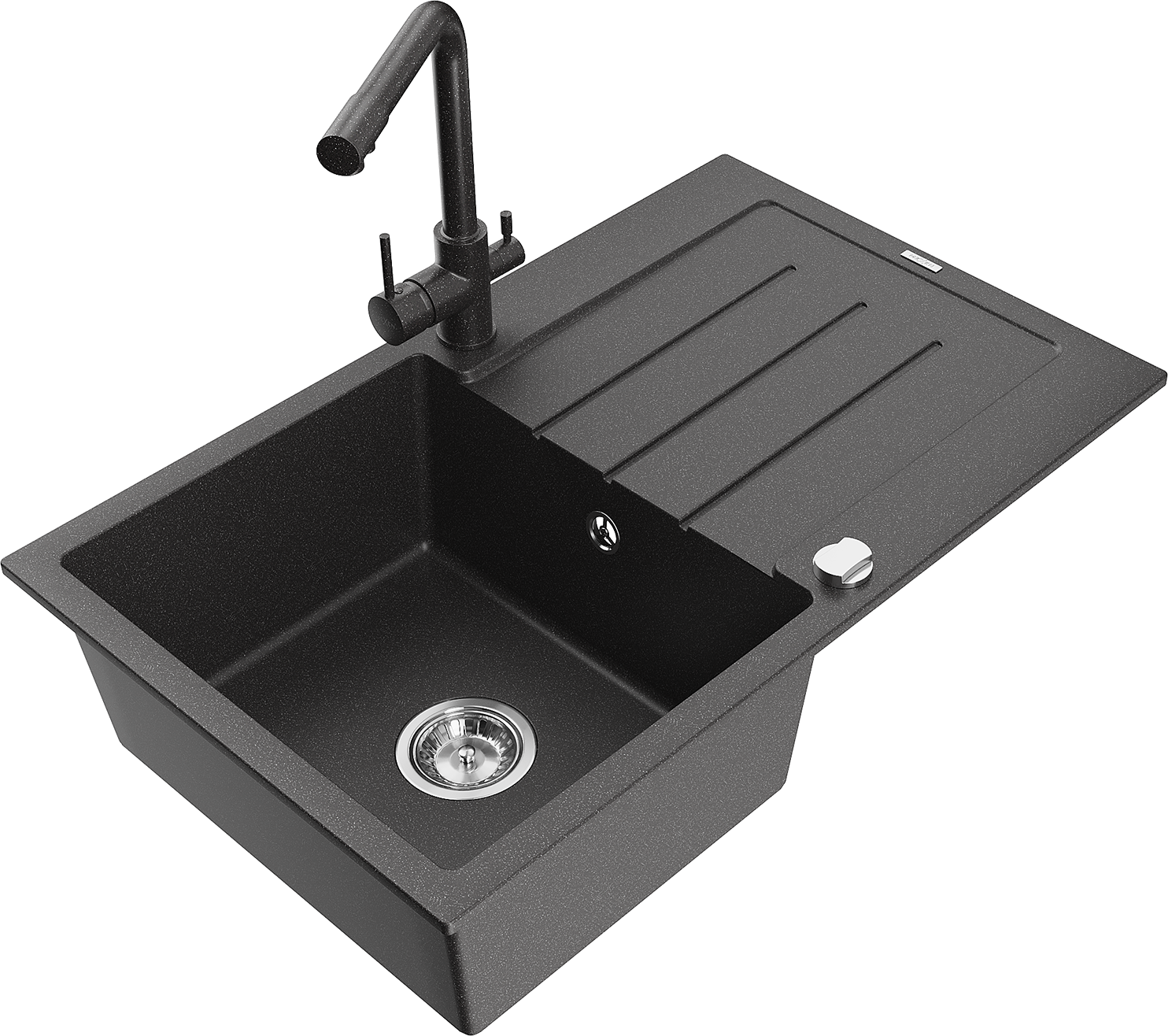 Mexen Bruno granīta izlietne ar vienu nodalījumu ar noteces un virtuves jaucējkrānu Duero, melna, ar punktiņiem