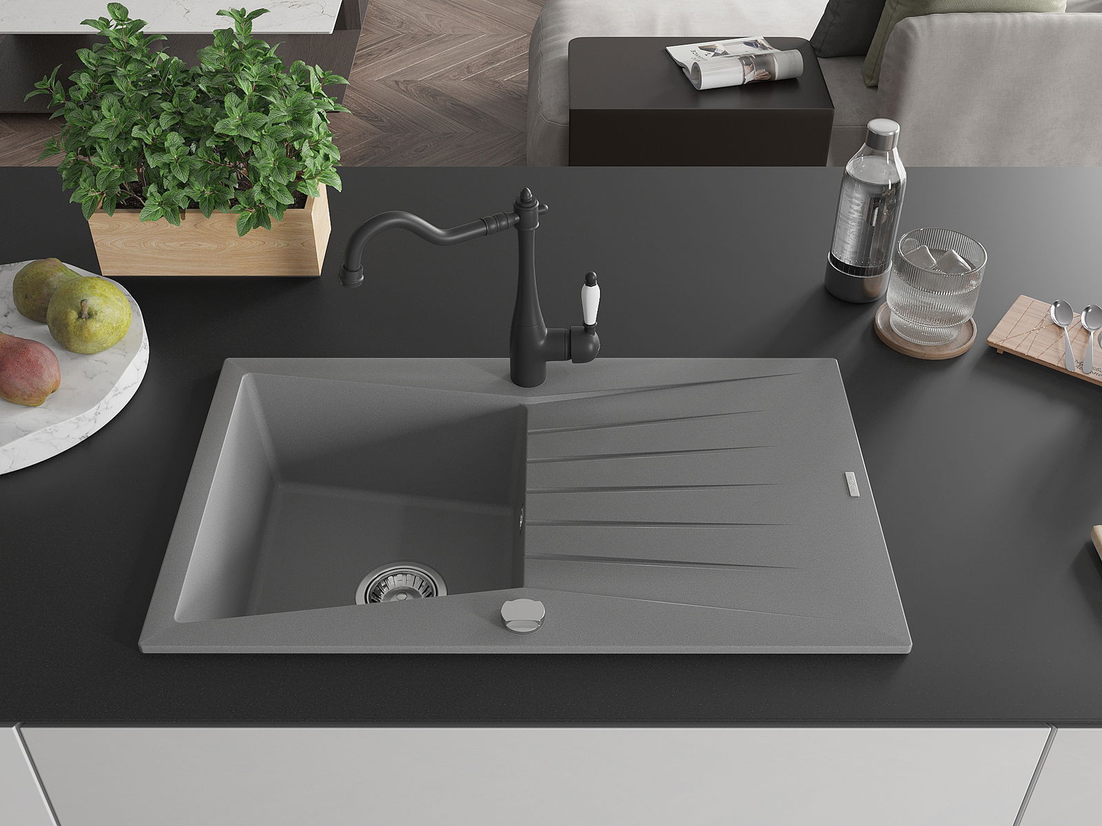 Mexen Cesar granit izlietne ar vienu nodalījumu, ar noteci un virtuves jaucējkrānu Carla, pelēka - 6514-71-670700-70