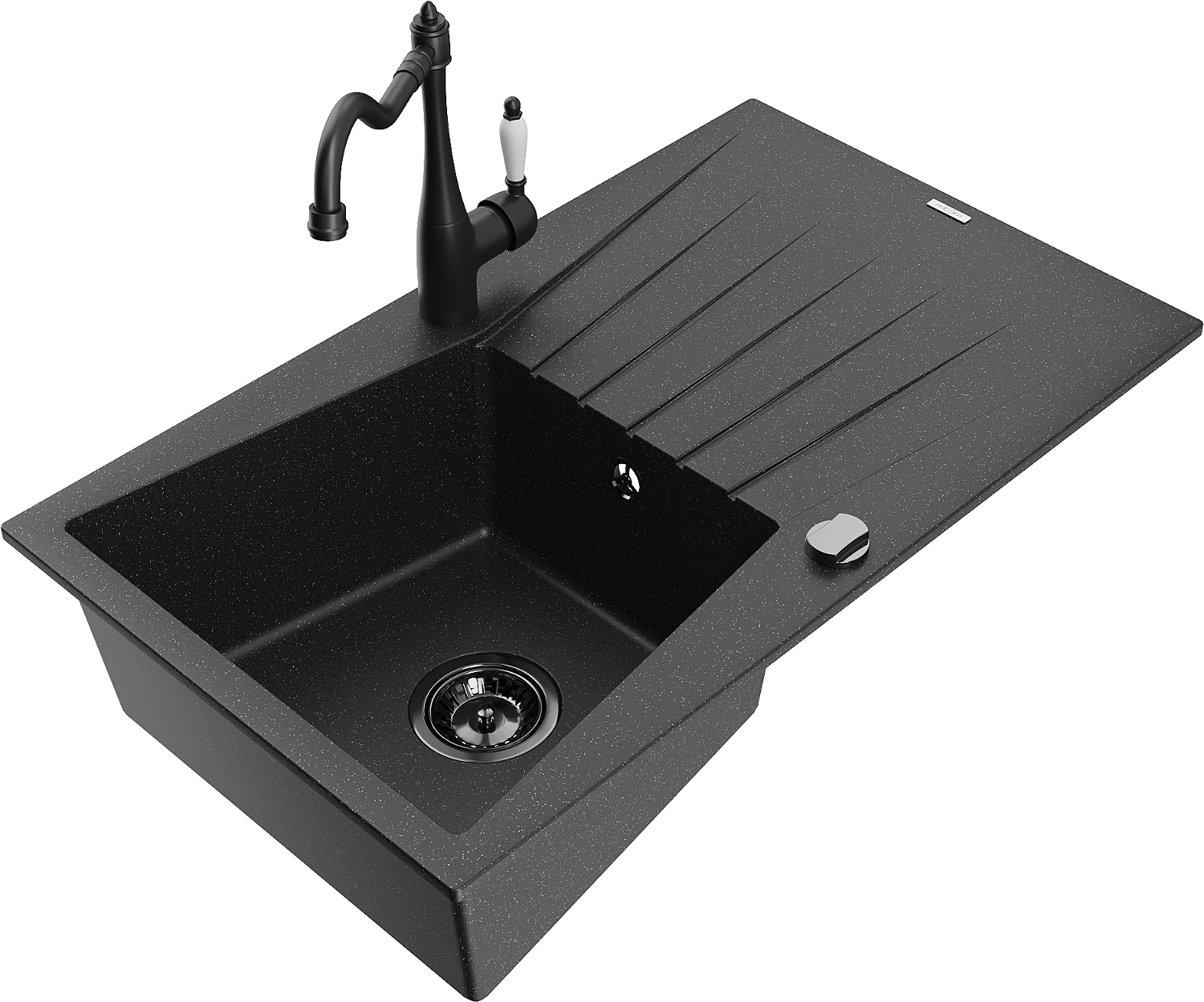 Mexen Cesar granitizlietne vienkameras izlietne ar noteci un virtuves krānu Carla, melna/sudraba metālisks