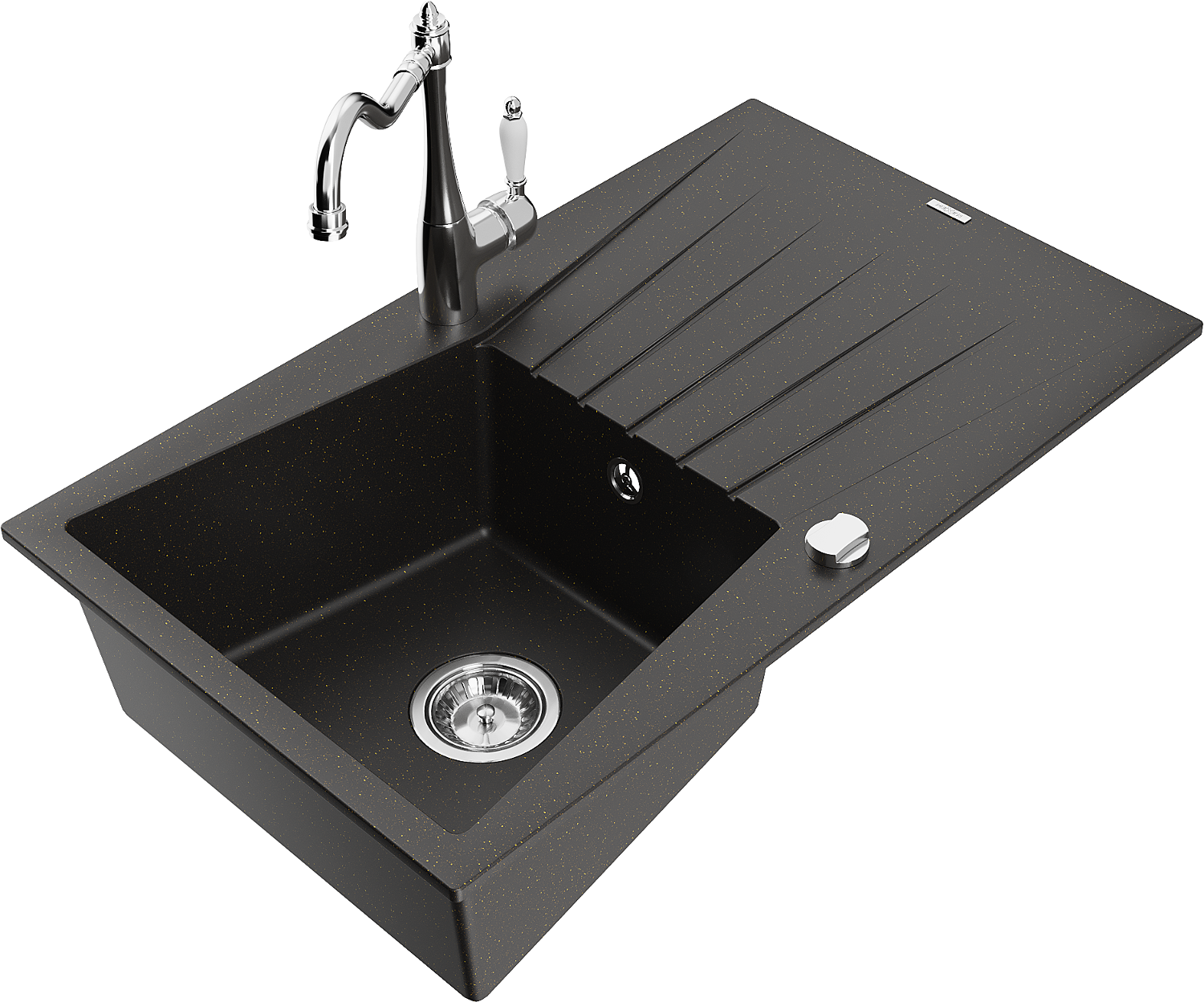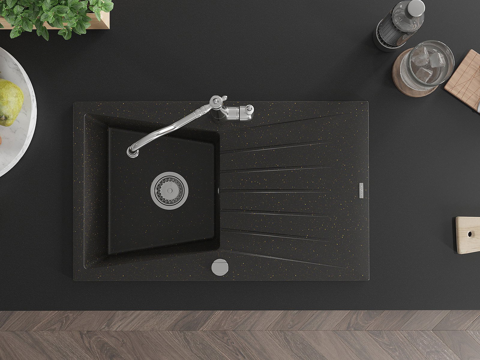 Mexen Cesar granitizlietne ar vienu nodalījumu, noteces un virtuves jaucējkrānu Carla, melna/zeltīta metālika