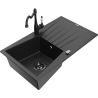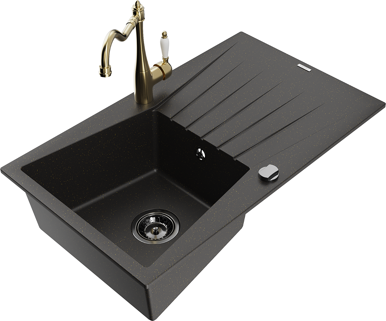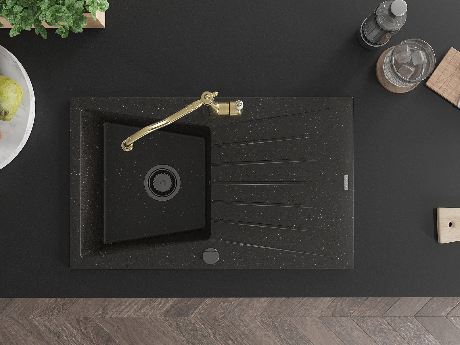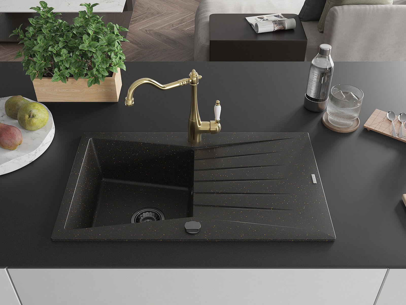 Mexen Cesar granīta virtuves izlietne ar vienu nodalījumu un noteces paliktni, ar virtuves maisītāju Carla, melns/zeltains